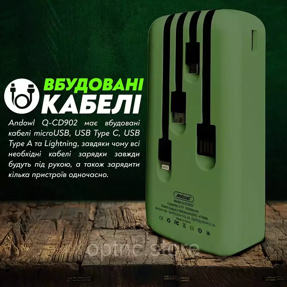 • Встроенные кабели. Andowl Q-CD902 имеет встроенные кабели microUSB, USB Type C, USB Type A и Lightning, благодаря чему все необходимые кабели зарядки будут всегда под рукой, а также зарядить несколько устройств одновременно.