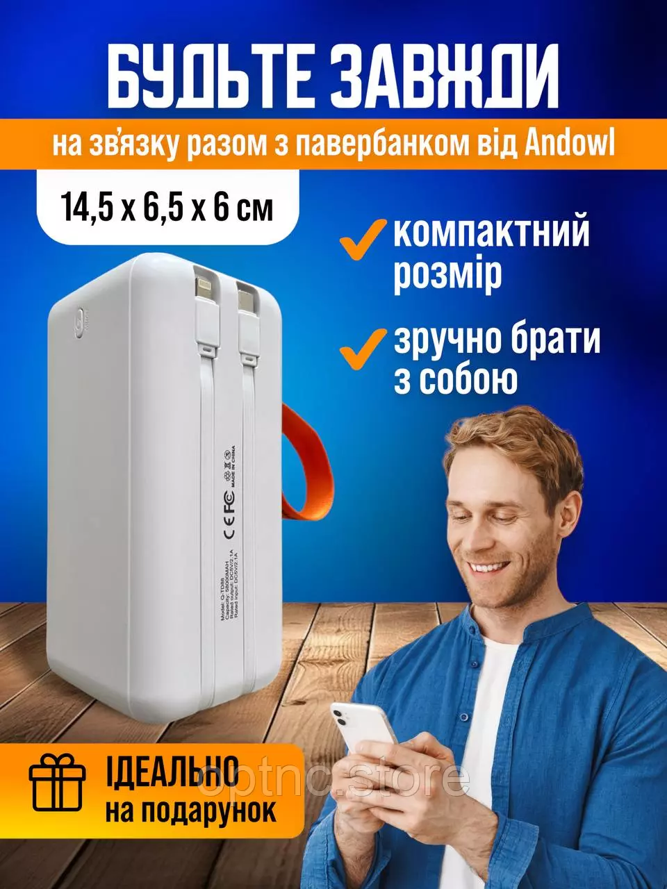 павербанк с собой. Стильный дизайн в сочетании белого и оранжевого