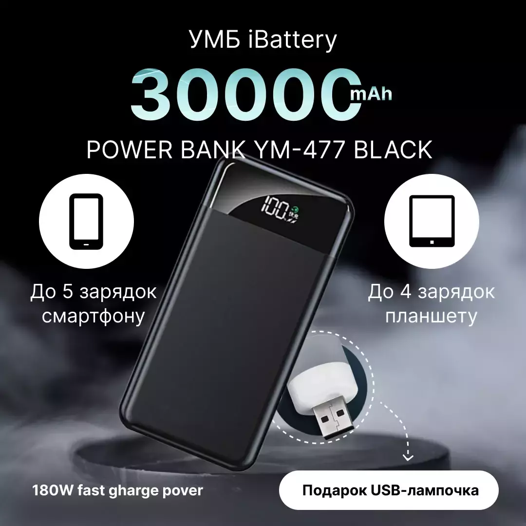 Портативная батарея iBattery YM-477 отличается стильным дизайном, высокой емкостью батареи и возможностью подключения нескольких устройств. Универсальная мобильная батарея iBattery YM-477 емкостью 30000 mAh совместима со всеми современными смартфонами и планшетами. Также УМБ iBattery YM-477 располагает наличием встроенных кабелей microUSB, USB Type C, USB Type A и Lightning с тыльной стороны устройства.