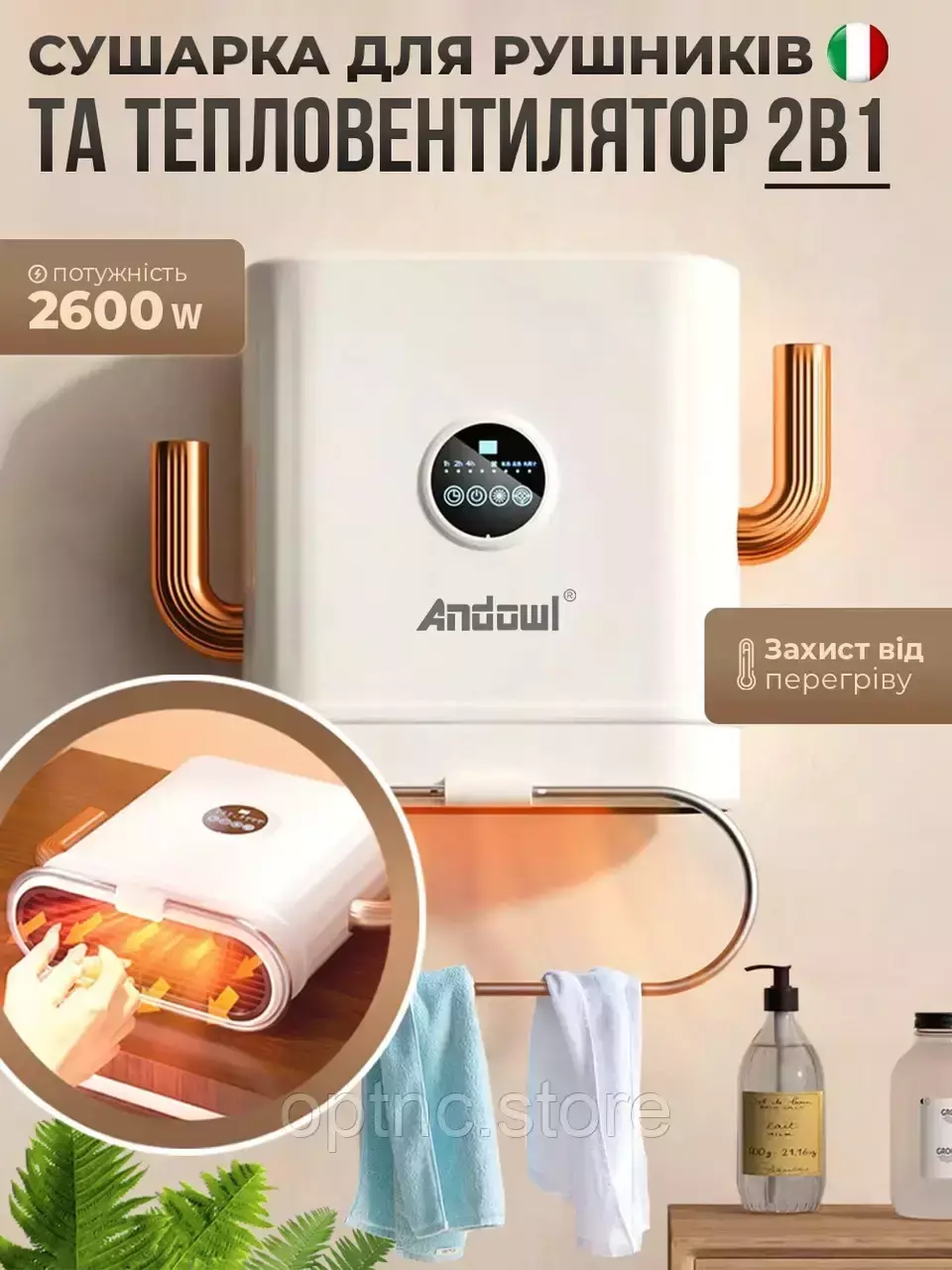 Ищете идеальное решение для обогрева ванной комнаты и сушки полотенец? Представляем вам многофункциональный обогреватель и полотенцесушитель Andowl Q-NF655. Этот элегантный прибор в бело-золотом цвете станет стильным дополнением интерьера, обеспечит вам комфорт и тепло в холодное время года.
