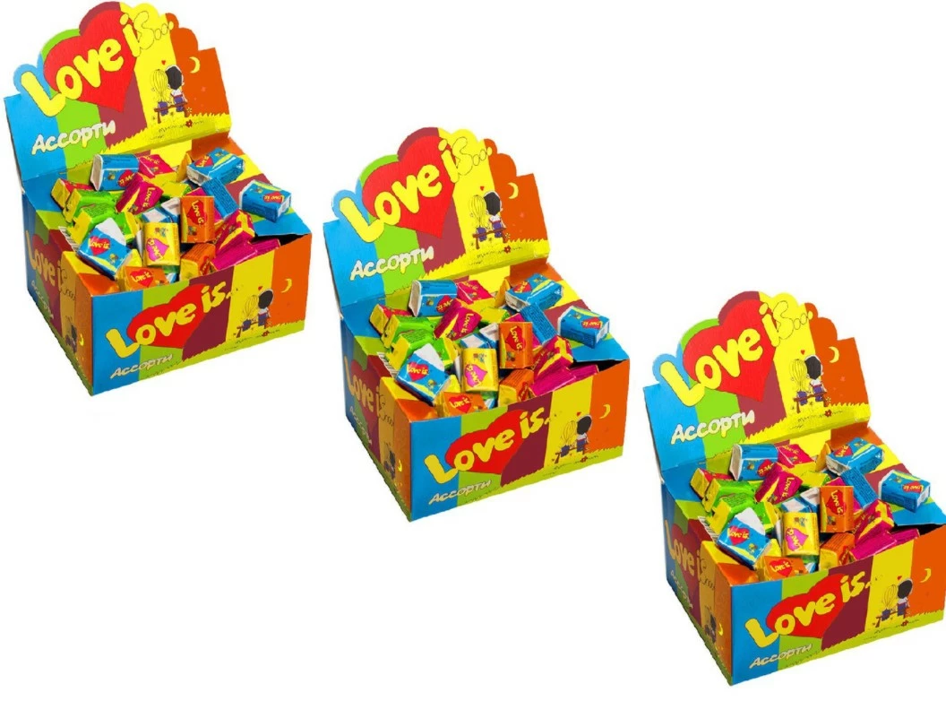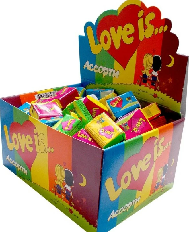 Популярные жевательные резинки с историями о любви на вкладышах. Подарите и вы самое волнительное чувство вашим любимым с жвачками Love is! В коробке можно спрятать обручальное кольцо, устроить романтический вечер из картинки, которая понравилась вашей половинке. Сохраняйте любовь и наслаждайтесь удивительным вкусом жвачки.