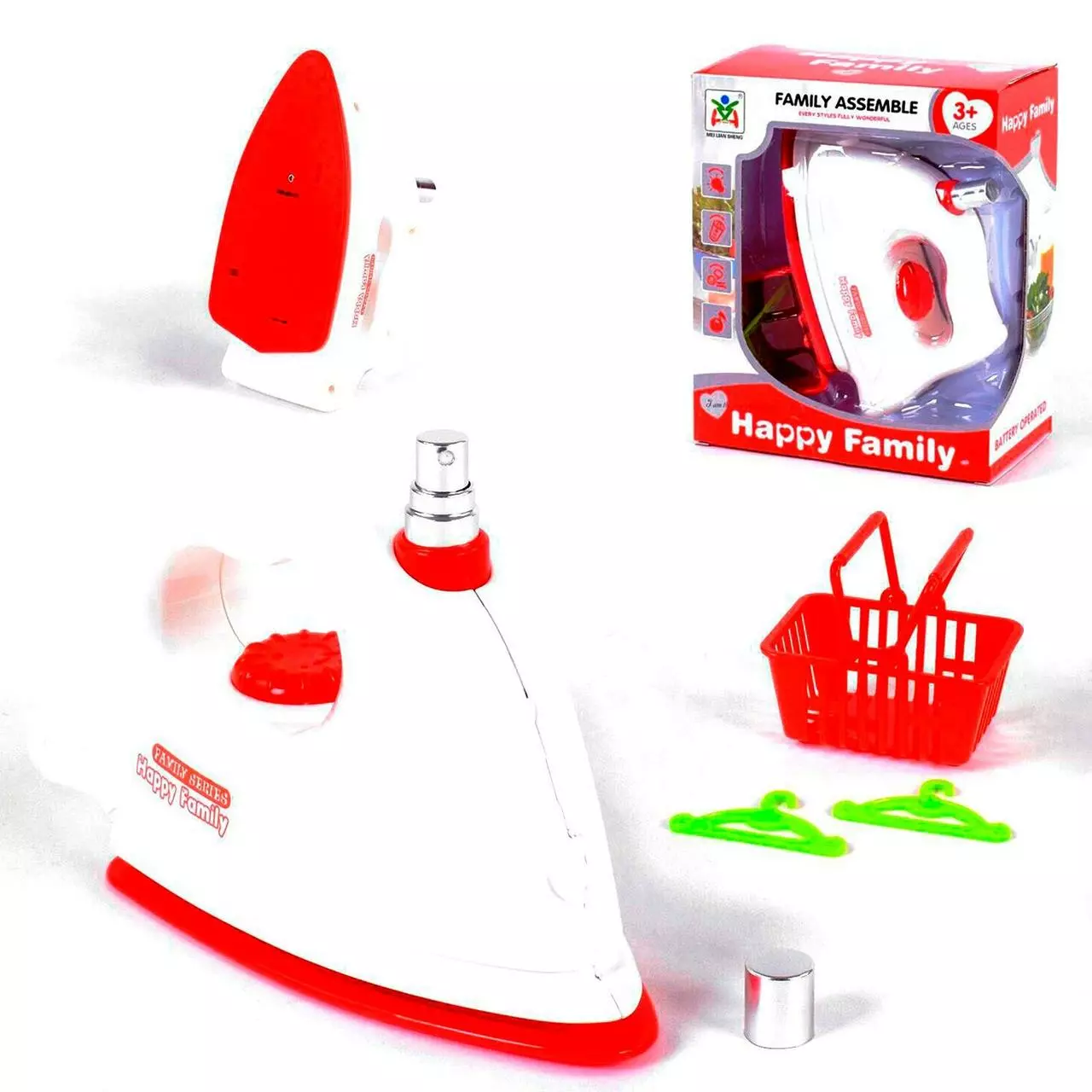 - корзинка для белья с ручками. Утюг работает от 2х батареек типа