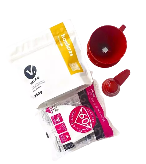 Набор для приготовления кофе альтернативым способом. В наборе кофе specialty Honduras Marcala (очень яркий на вкус, ноты горького шоколада, персика и карамельных конфет); пуровер Hario V60, очень удобный и практичный аксессуар для приготовления кофе; бумажные белые фильтры для пуровера.