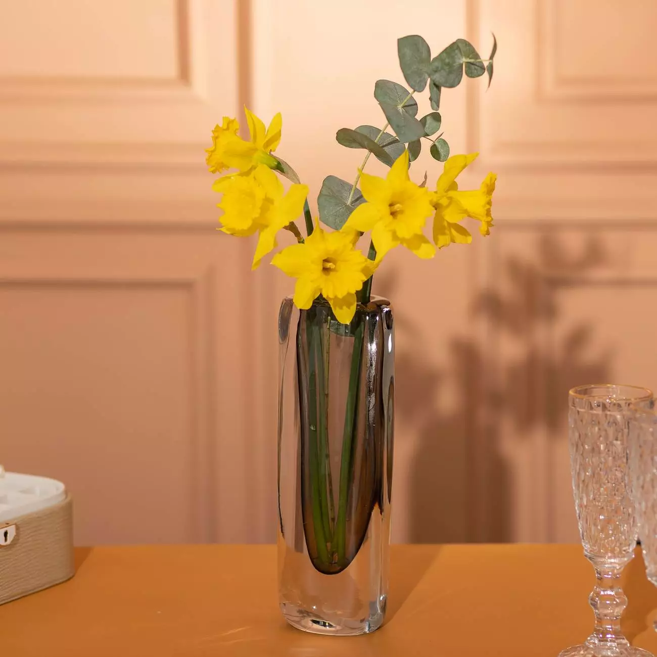 Мінімалістичний стиль вази підкреслює чистоту форм та функціональність, зосереджуючи увагу на квіткових композиціях чи інших декоративних елементах. Прозоре скло дозволяє створити елегантний акцент без зайвих прикрас.