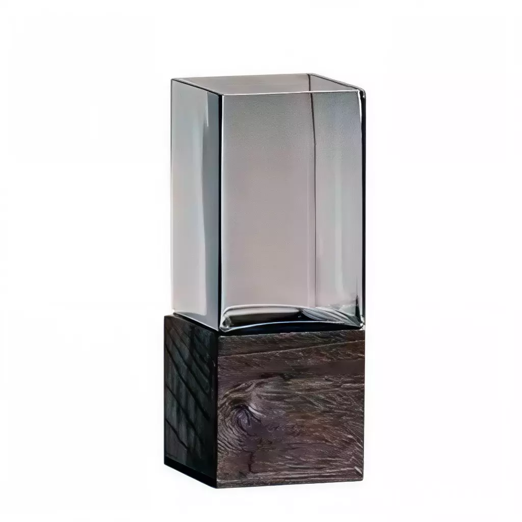 Ефектна ваза, що поєднує прозорість скла та теплу фактуру натурального дерева. Суворі геометричні форми та мінімалістичний дизайн роблять її універсальним елементом декору: підійде як для сучасних інтер'єрів у стилі мінімал та скандинавського затишку, так і для контрастних акцентів у класичних приміщеннях.