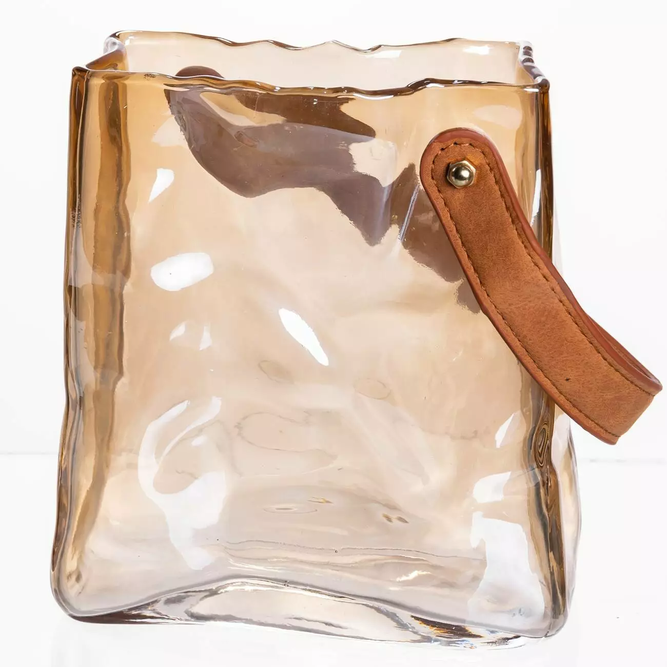Ця стильна ваза поєднує у собі простоту форм та виразну фактуру: товстостінне скло плавно вигинається, створюючи м'які хвилі та гру світла. Невеликі нерівності та легка асиметрія підкреслюють ефект ручної роботи, роблячи вазу унікальною. Декоративна ручка з екошкіри додає теплоти та натуральної фактури, дозволяє легко переміщати виріб та використовувати його як акцентну деталь в інтер'єрі.
