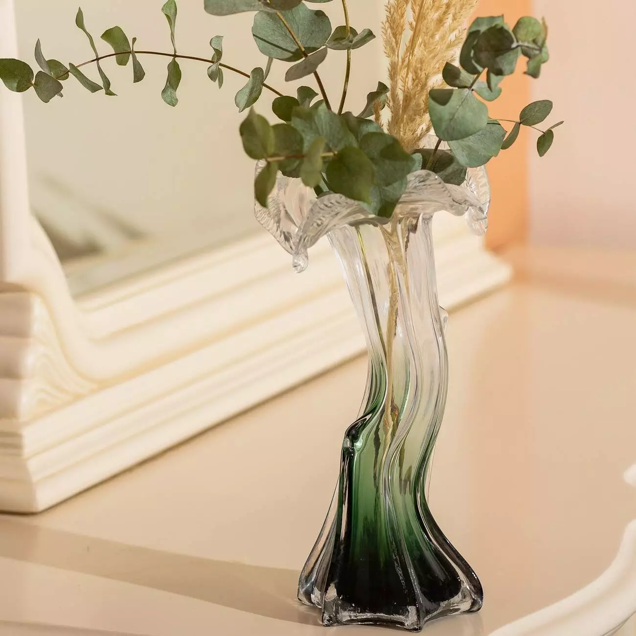 зеленуватого скла робить вазу помітною деталлю інтер’єру. Вона