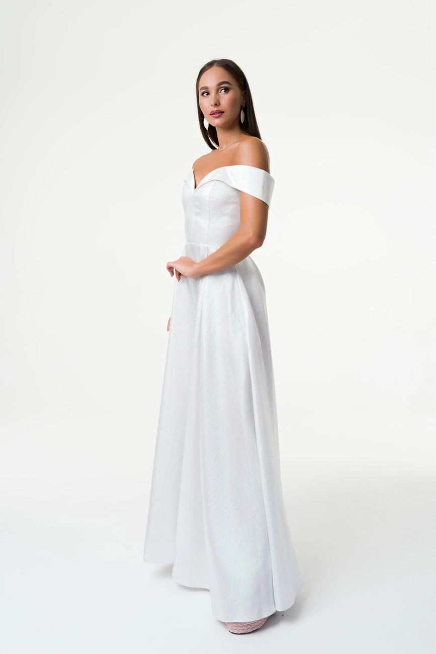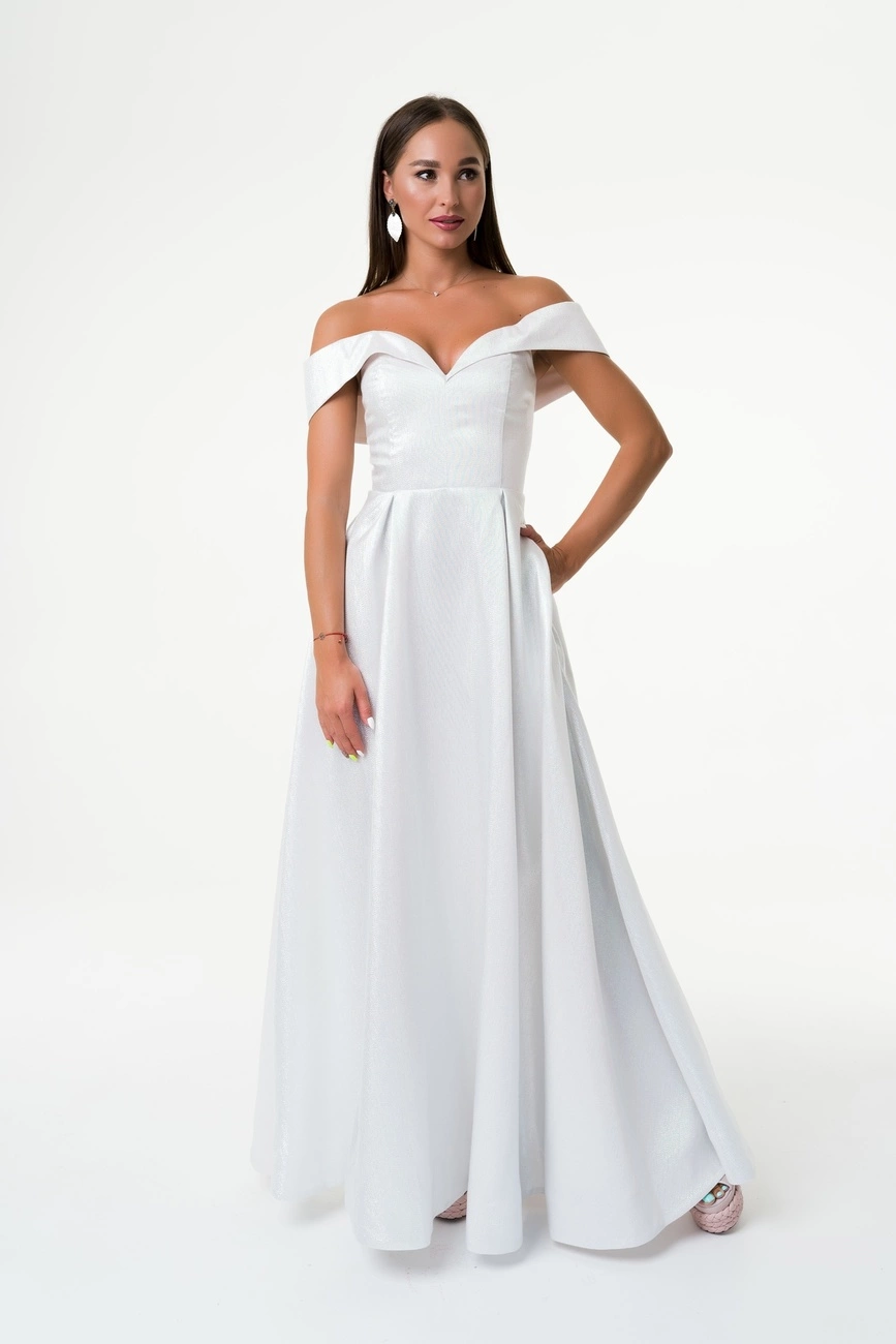 Вечернее жаккардовое платье с приспущенными плечами на корсетной основе.