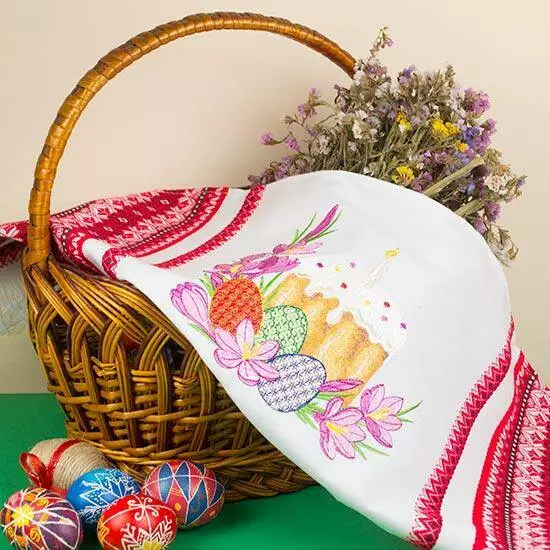 Який Великдень без пасхального хліба і писанок? Це символи, які вже багато років супроводжують це свято. Ми створили композицію з смачненької паски і писанок з традиційними орнаментами, та першими весняними квітами, вишили її на рушнику, який неодмінно прекрасить вашу пасхальну корзину.