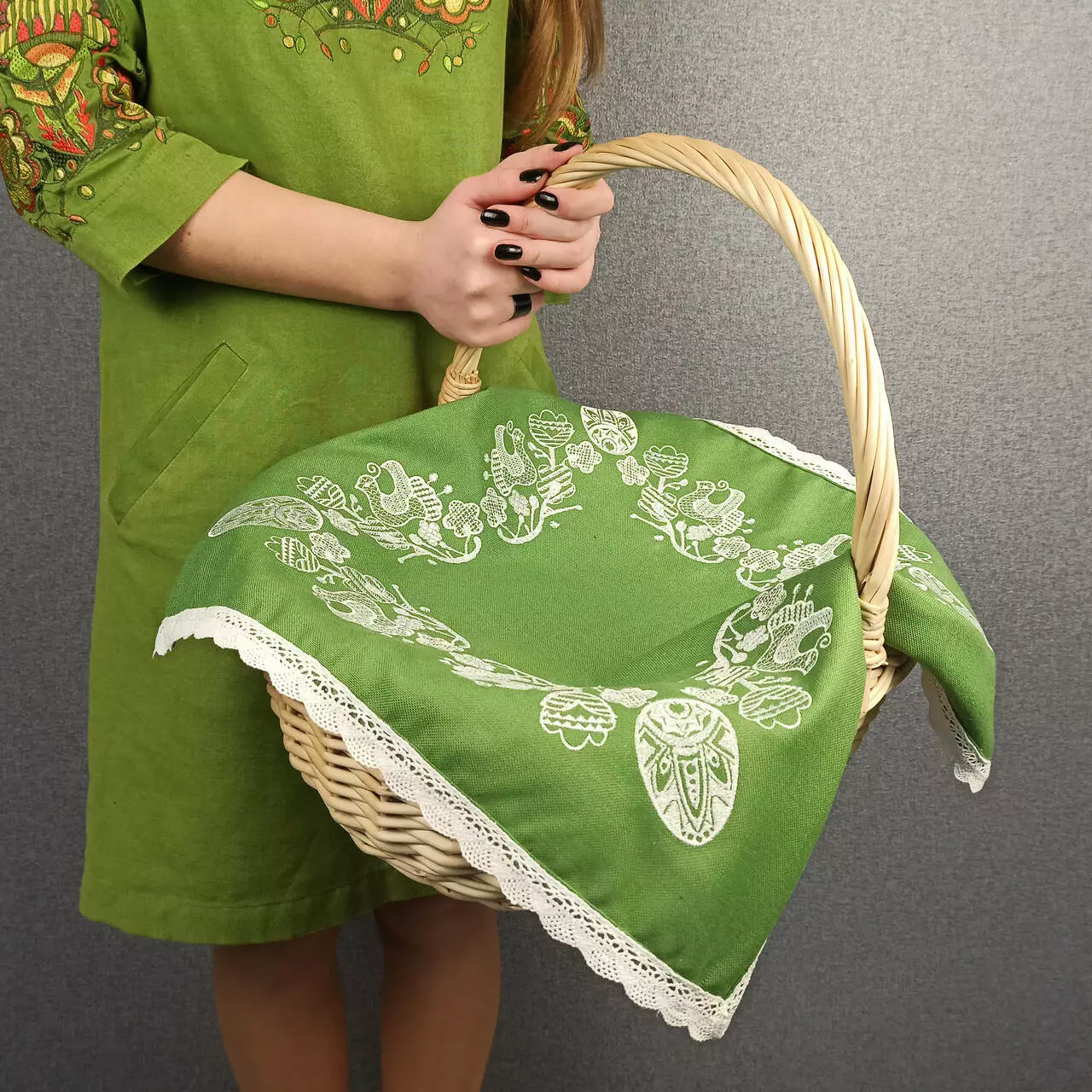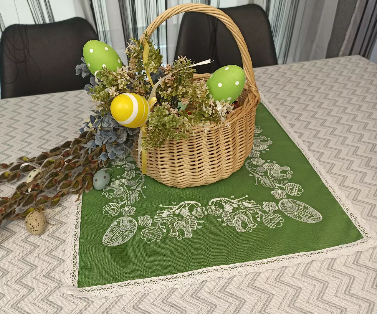 Пасхальна серветка на зеленому домотканому полотні, з мереживом по краях, прикрашена машинною вишивкою гладдю в білому кольорі. Розмір достатній, щоб використовувати для великоднього кошика середнього і великого розміру, або як столешню на стіл.