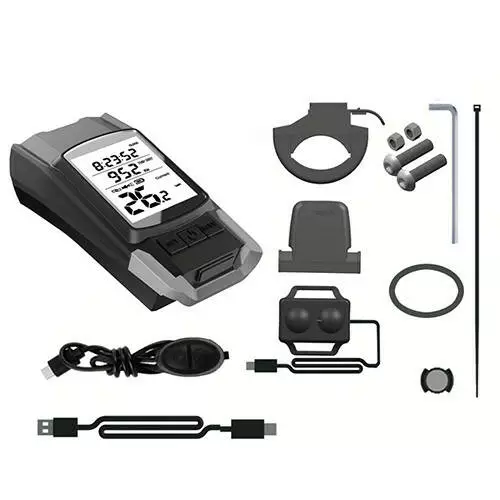 вело компьютер, крепления, магнитный датчик, выносная кнопка, кабель USB-microUSB, инструкция на английском языке