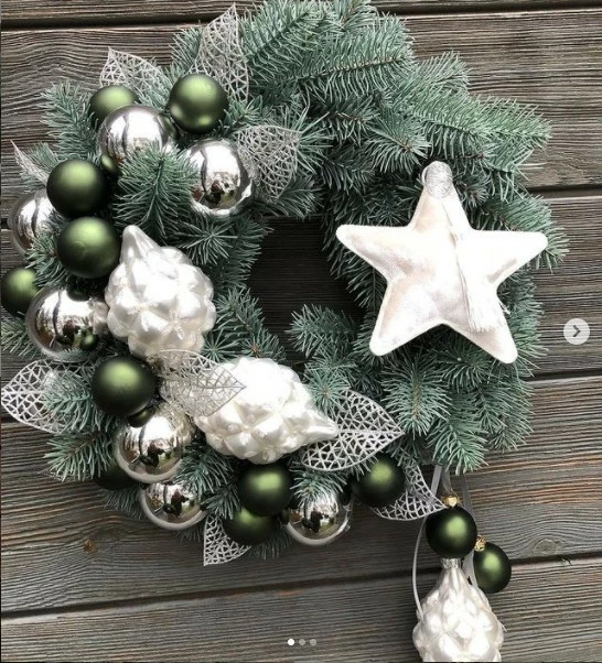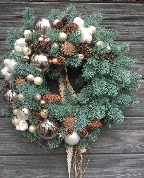 Самый распространенный вариант – украшение входной двери. Повесьте хвойный венок на межкомнатную дверь в гостиную или спальню. Вы можете купить любой новогодний еловый венок и просто повесить его с наружной стороны двери. Или проявить фантазию и украсить добавив по своему вкусу банты, колокольчики, шарики или деревянные подвески, снежинки или несколько веток ягод. Либо приукрасить несколькими дольками декоративного апельсина, палочками корицы, шишечками. Вариантов может быть множество, придумывайте рождественскую композицию вместе с детьми, они тоже захотят проявить фантазию. Внизу двери можно поставить светящийся фонарик или напольные вазы с хвойными ветками. Завершает общий облик хвойная гирлянда в том же стиле, оформленная в тех же тонах.