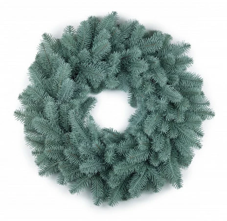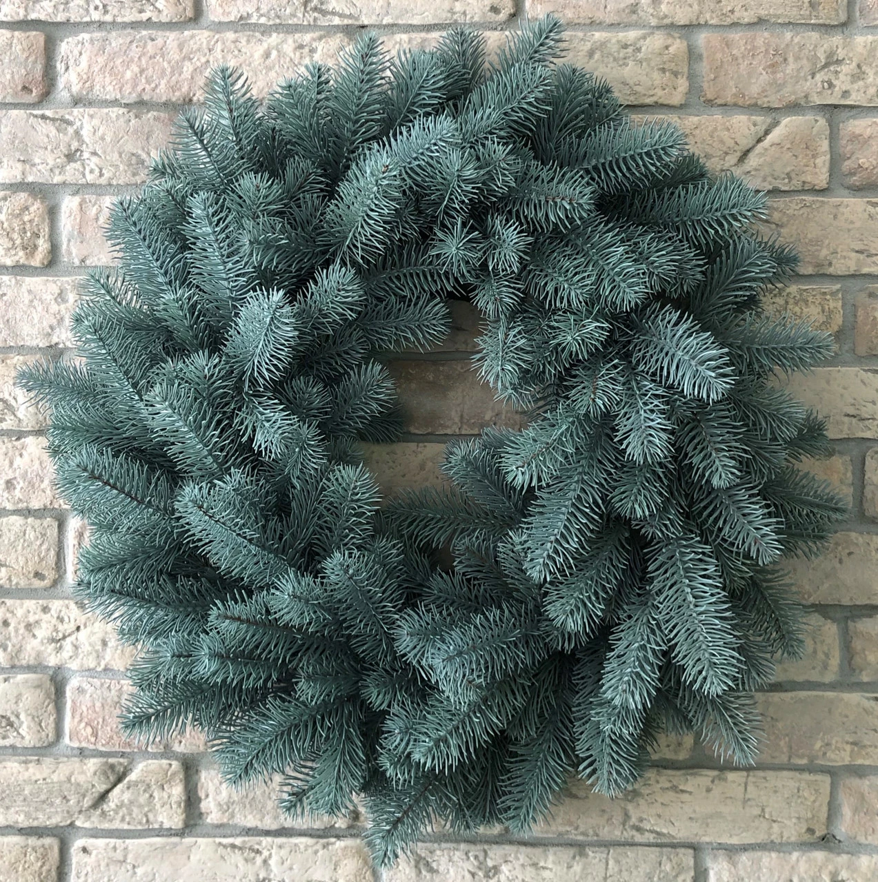 Новогодний декоративный венок диаметром 55 см представляет собой переплетенные ветки искусственной ели. Изготовлен из 100% литой хвои. Иголочки как у живой ёлки, но более мягкие и не колючие. Без декора.