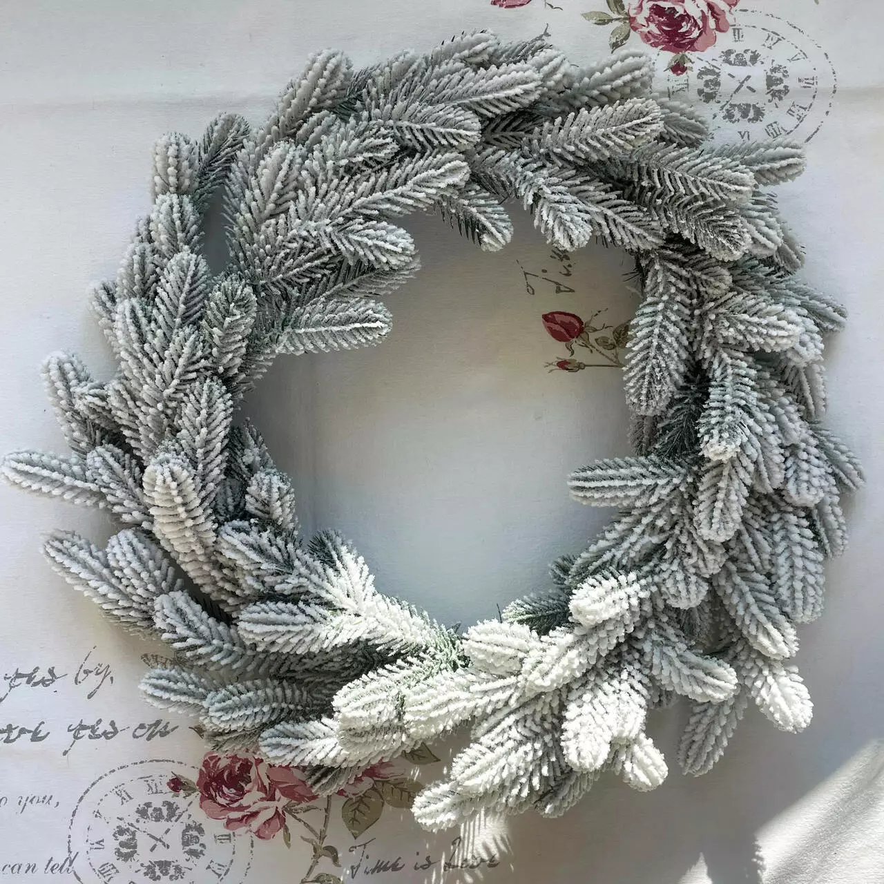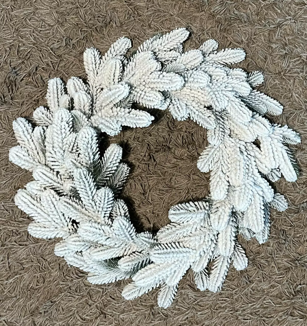 Новогодний декоративный венок диаметром 50 см представляет собой переплетенные ветки белой искусственной ели. Изготовлен из 100% литой хвои. Иголочки как у живой ёлки, но более мягкие и не колючие. Без декора.