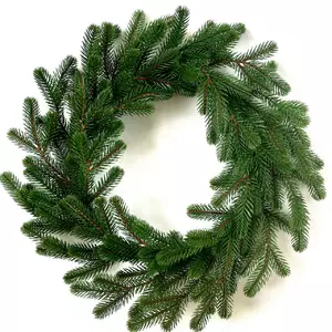 Новогодний декоративный венок диаметром 50 см представляет собой переплетенные ветки искусственной ели. Изготовлен из 100% литой хвои. Иголочки как у живой ёлки, но более мягкие и не колючие. Без декора.