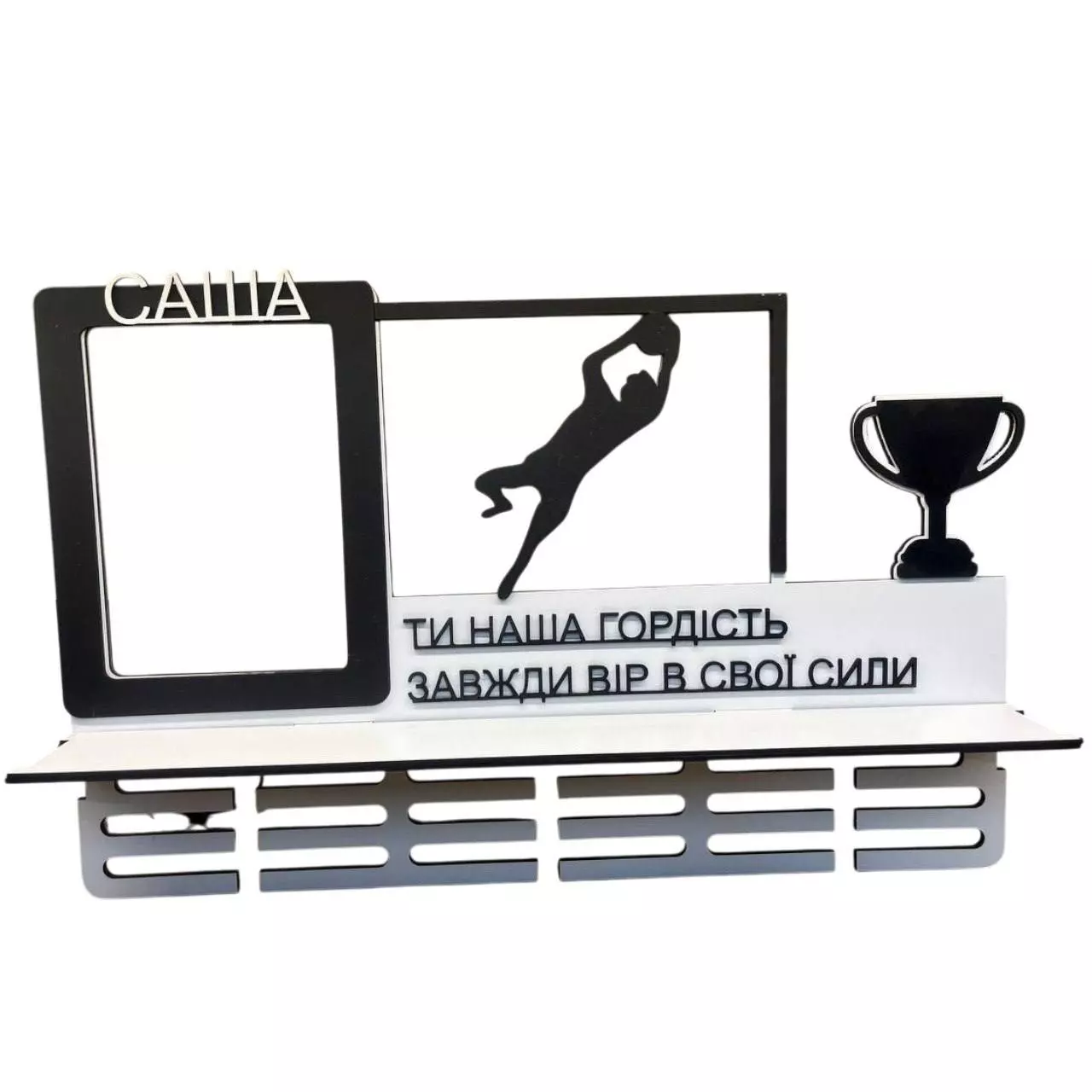 Вешалка для медалей футбольный вратарь с полкой и подсветкой 59х39 см Бело-черная