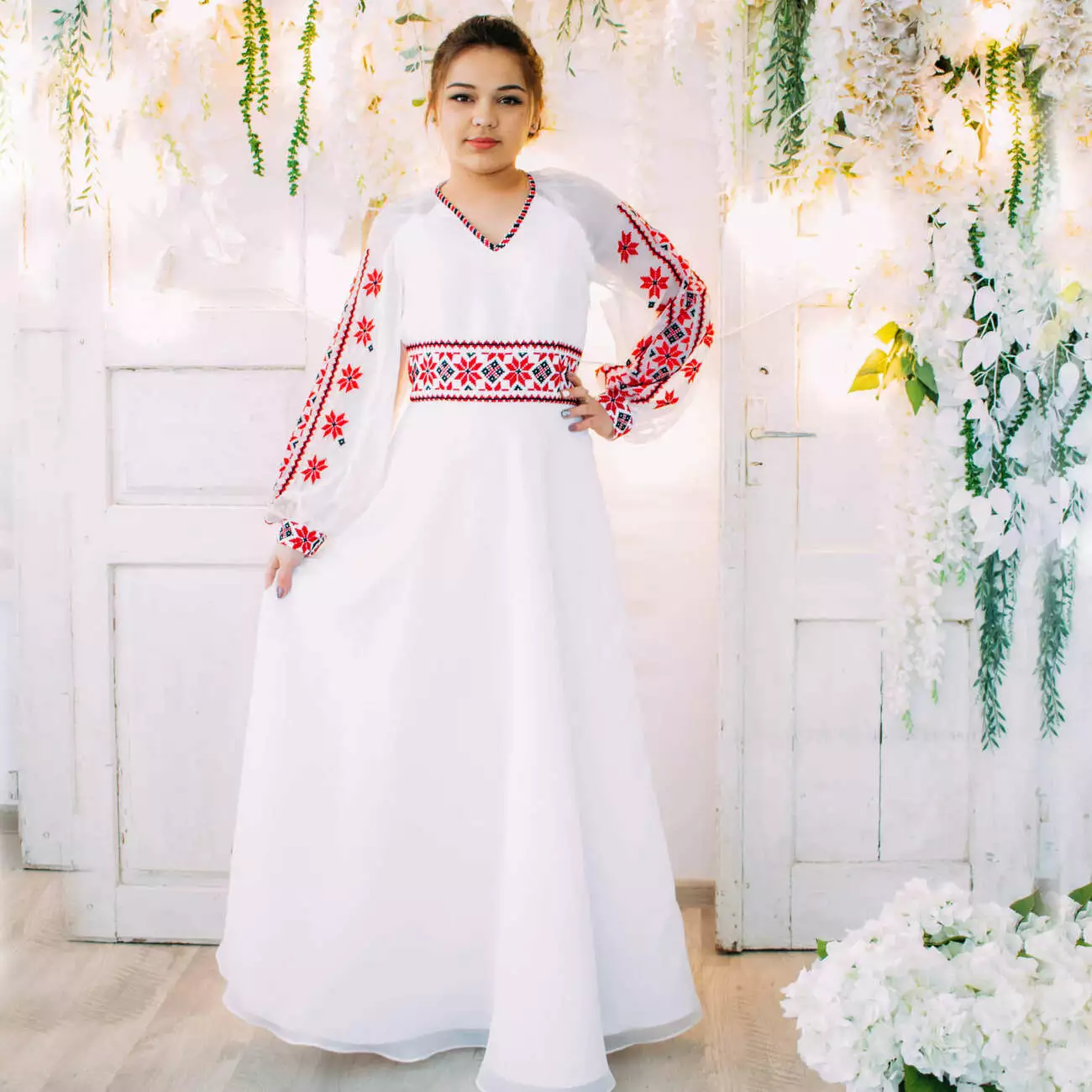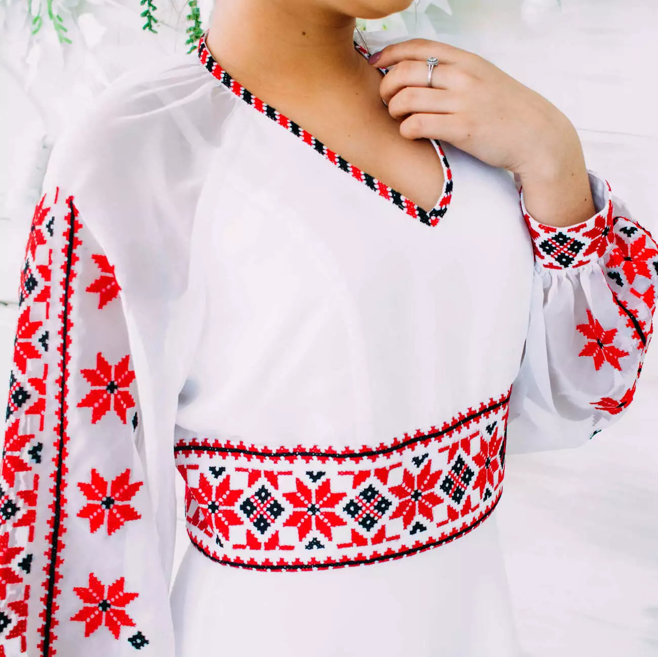 оригінальним вишитим червоно-чорним візерунком на рукавах, від