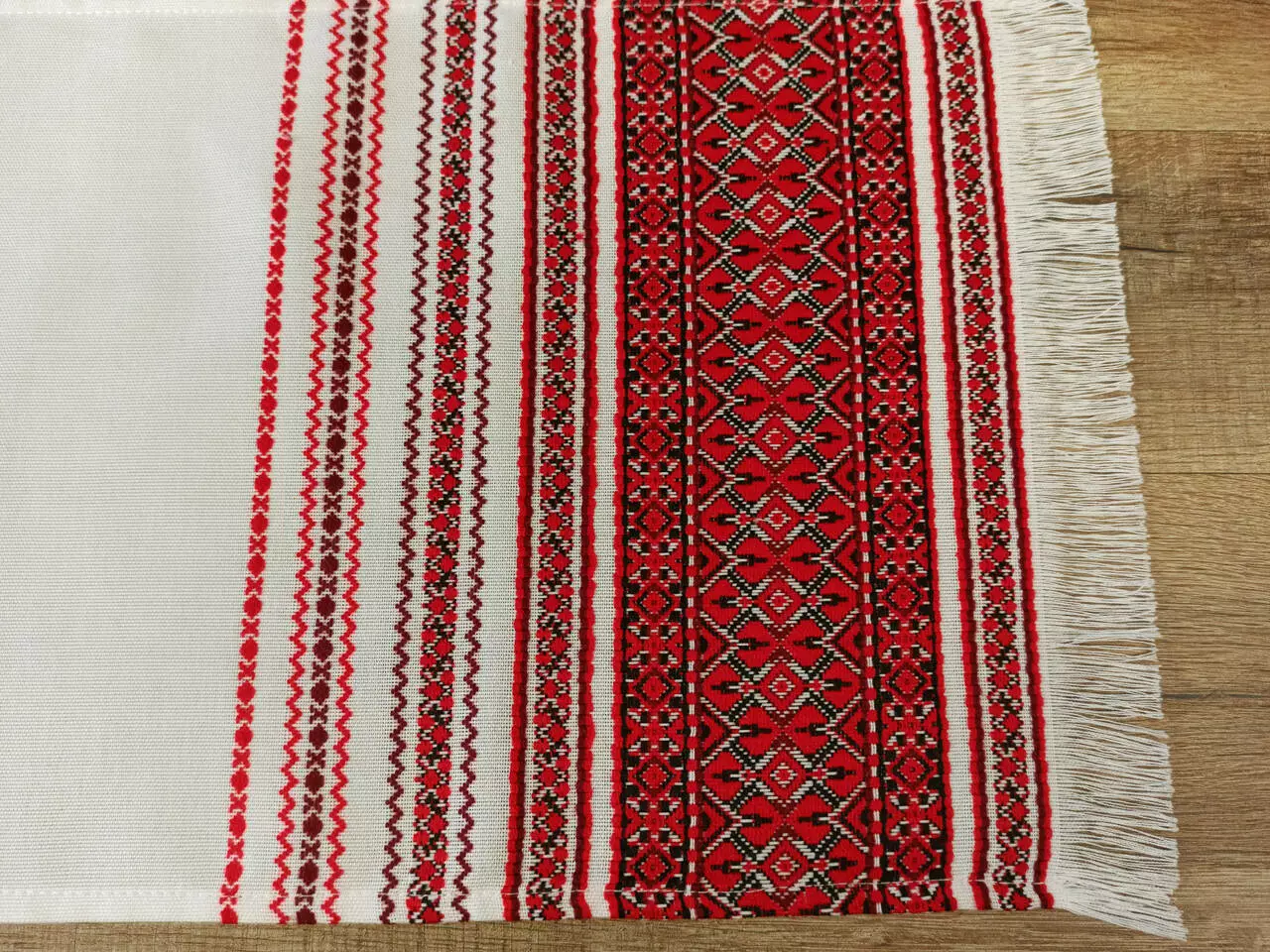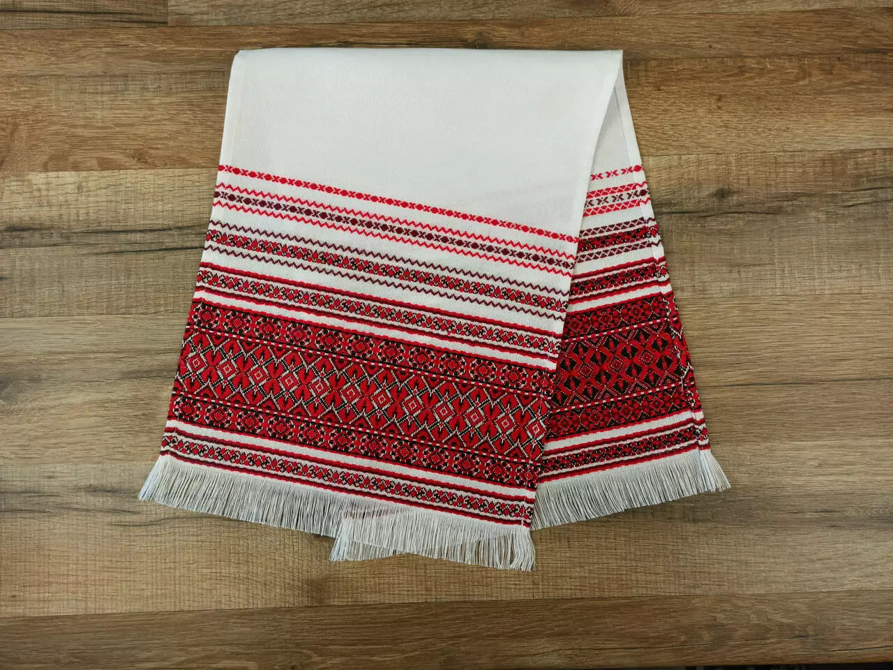 Традиційний червоний вышитий рушник, який широко використовується в українських обрядах.