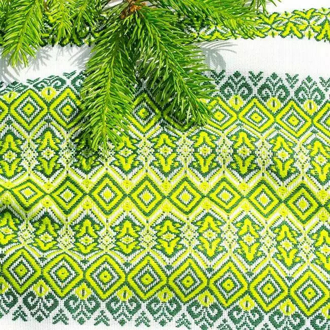 Весільний рушник під коровай з орнаментом у радісній зеленій палітрі.