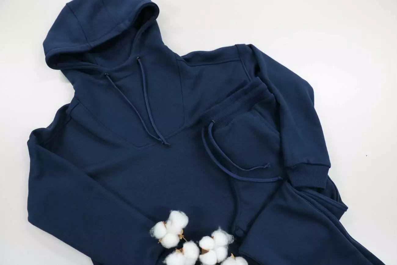 Худі костюму виконано в класичному вільному крої, прямого силуету, сидить нижче попи. Капюшон подвійний