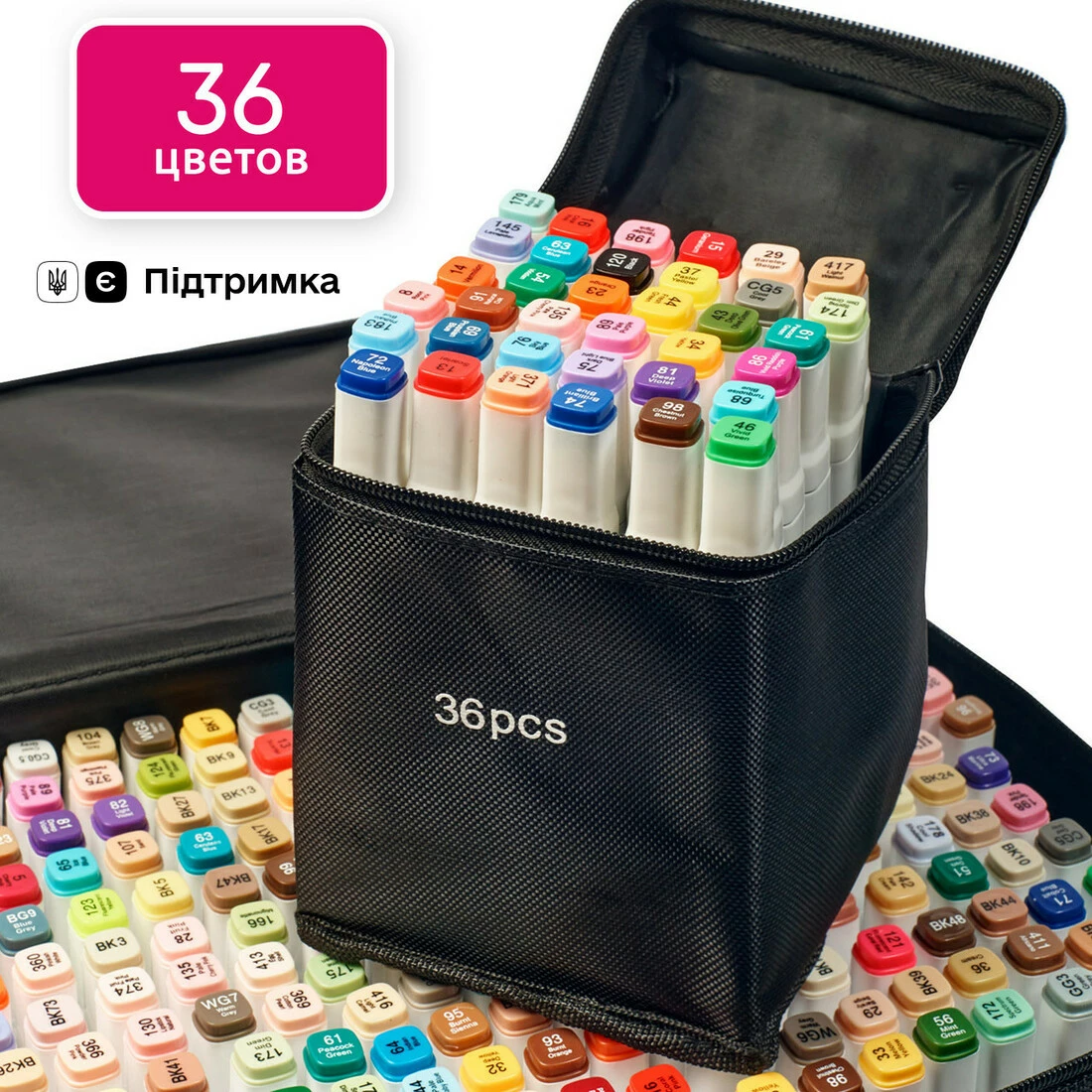 В наборе 36 маркеров разных цветов. Корпус пластиковый, гладкий.