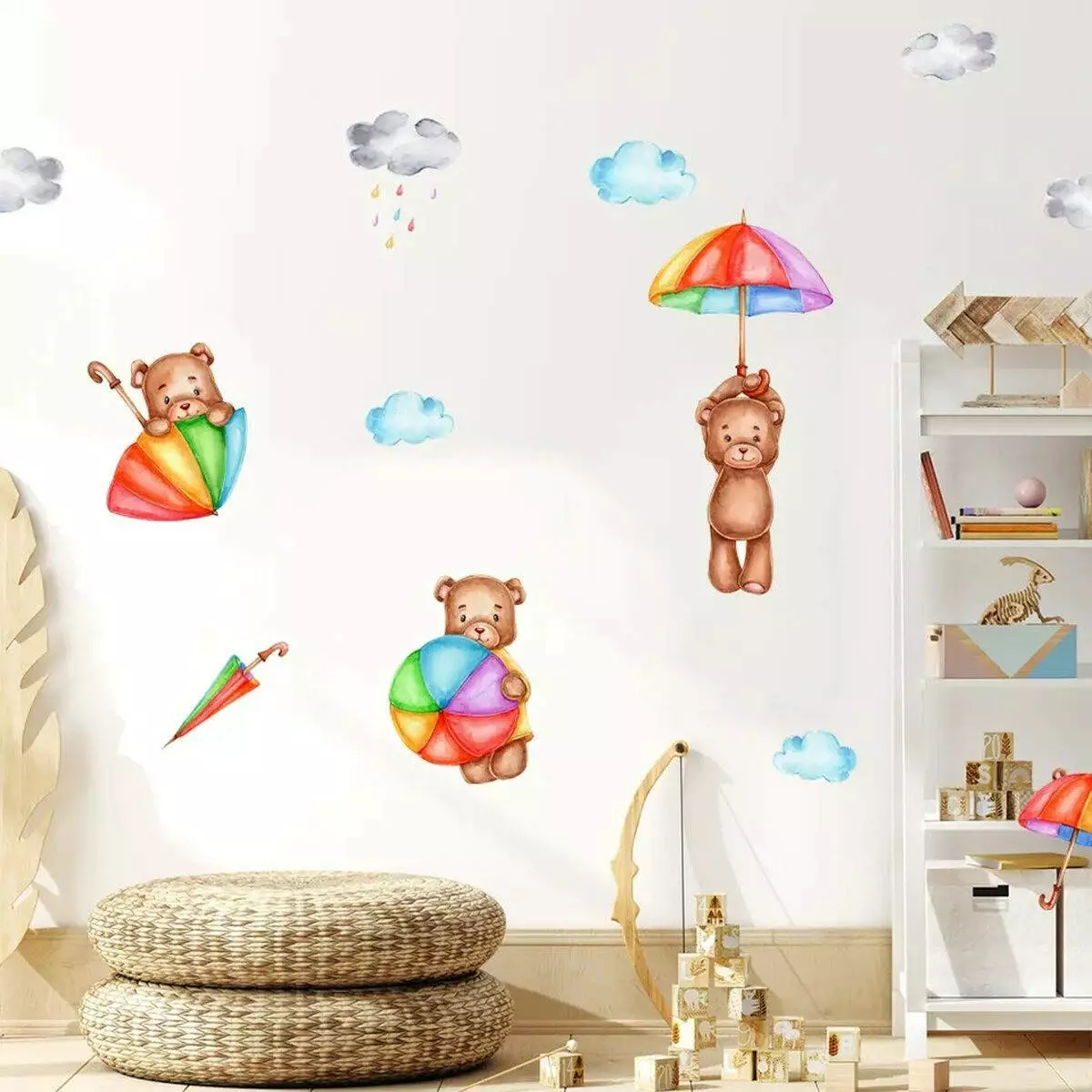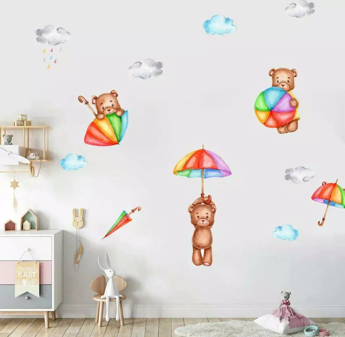Три унікальних ведмедика з парасолькою, веселкою і хмаркою.