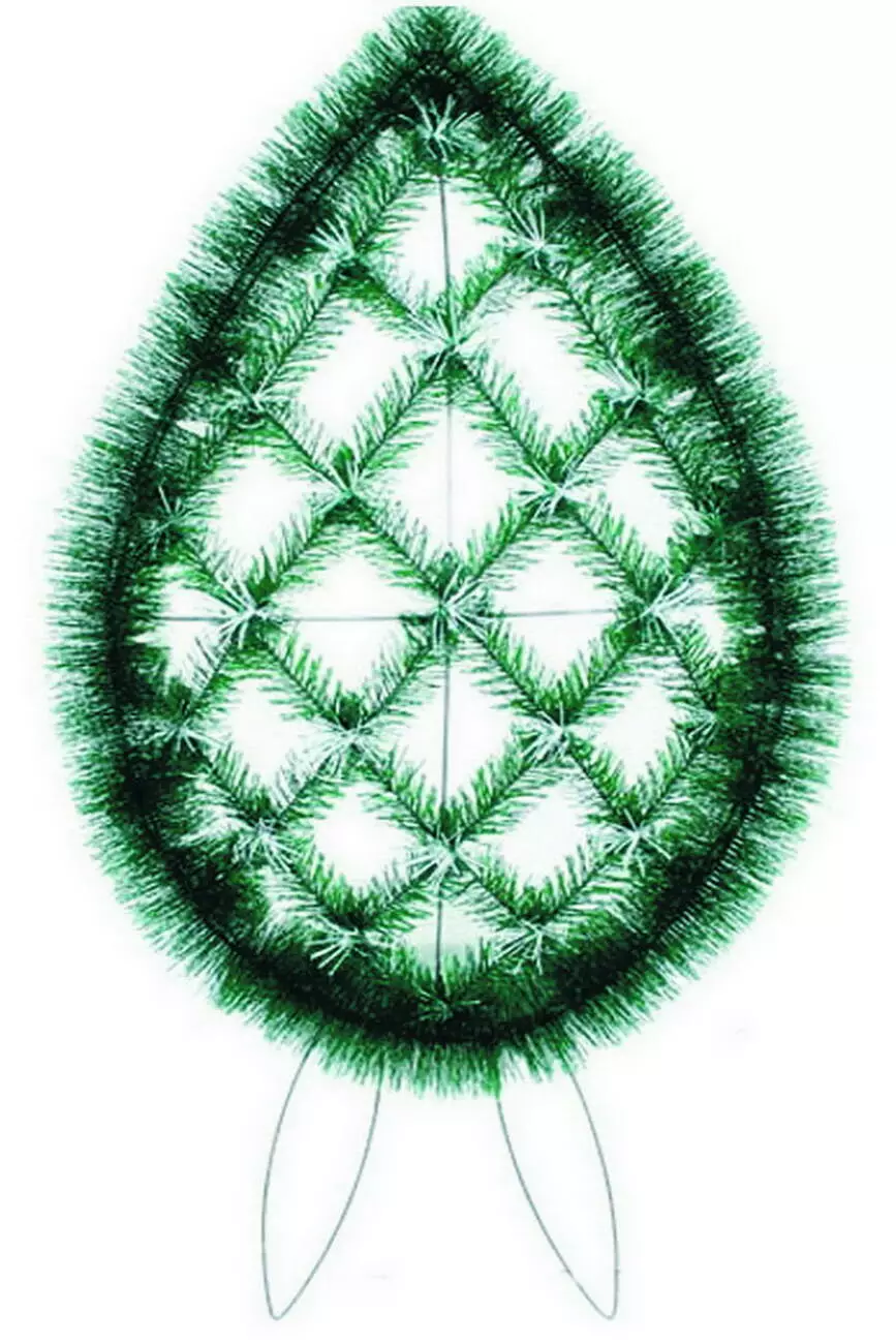 Вінок зі штучної хвої, по центру заплетений сіткою, по краю йорш, розмір 115*55*18 см.