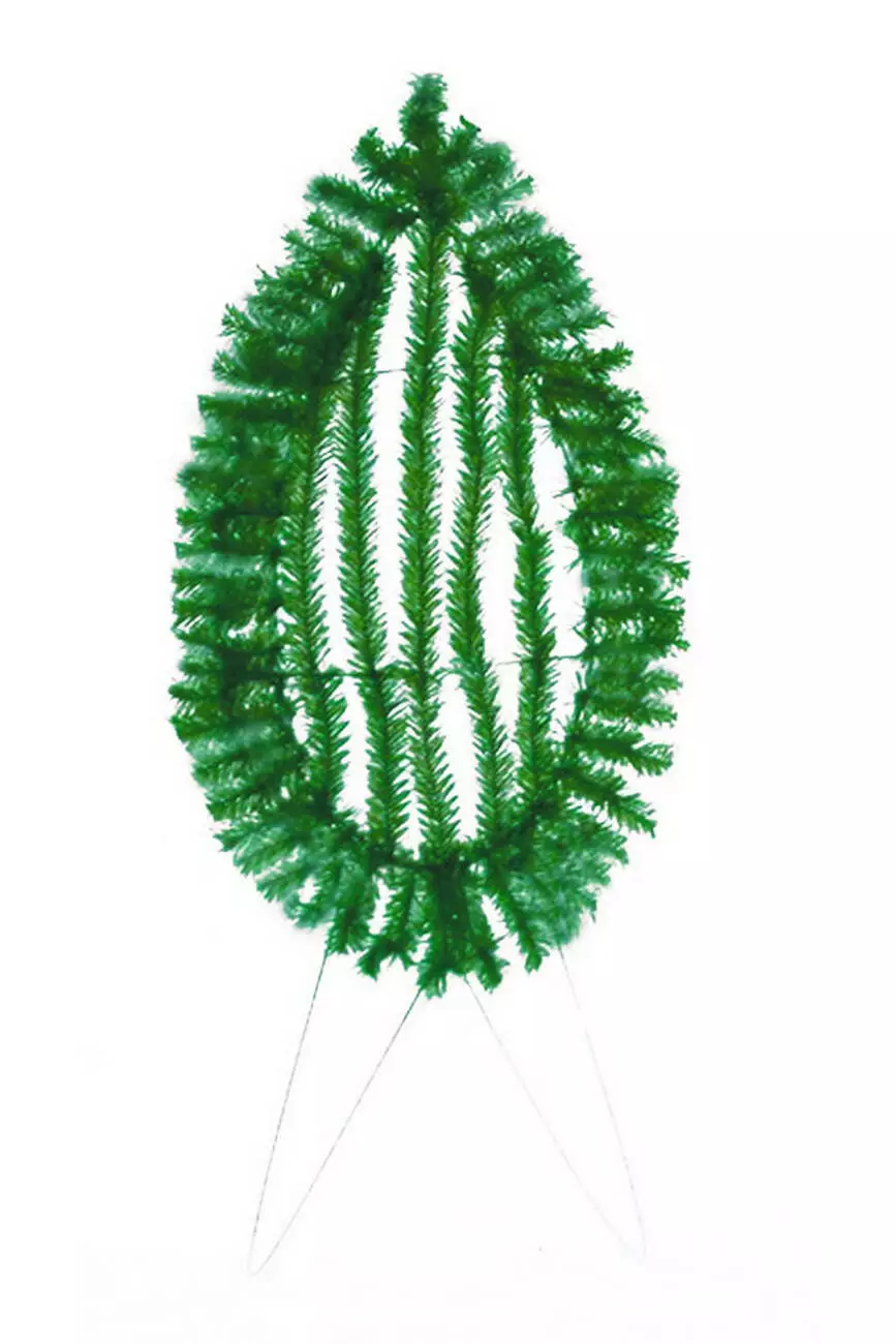 Вінок зі штучної хвої, зашит по центру вертикально прямими хвойними гілками, края заплетені по колу відрізками хвої розмір 140*50*20 см.