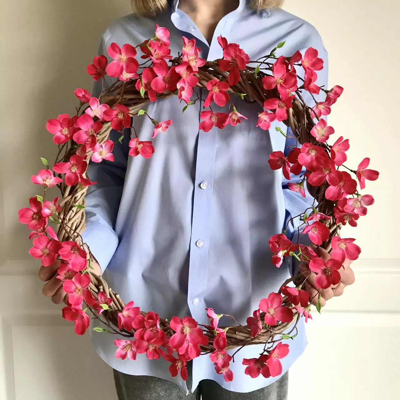 Цей вінок не лише прикрашає ваш простір, але й створює відчуття весняного чуда прямо в середині вашого дому чи офісу. Він легко вписується в будь-який інтер'єр, даруючи йому тепло та елегантність.