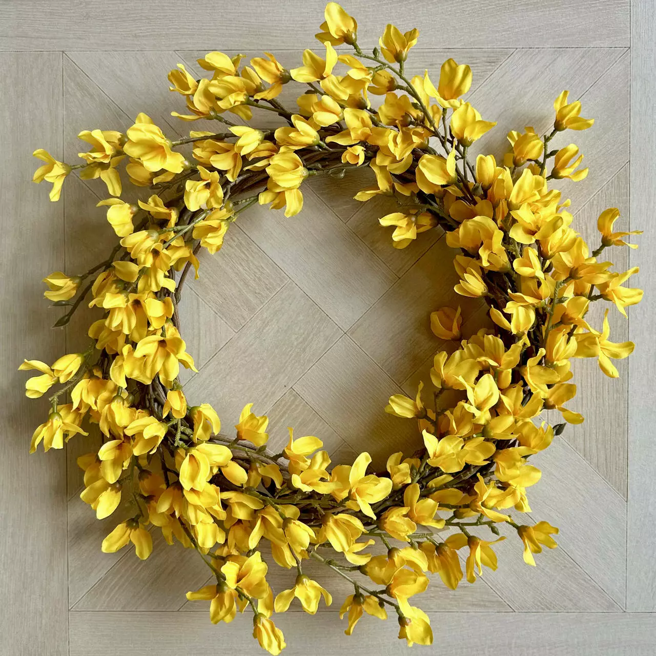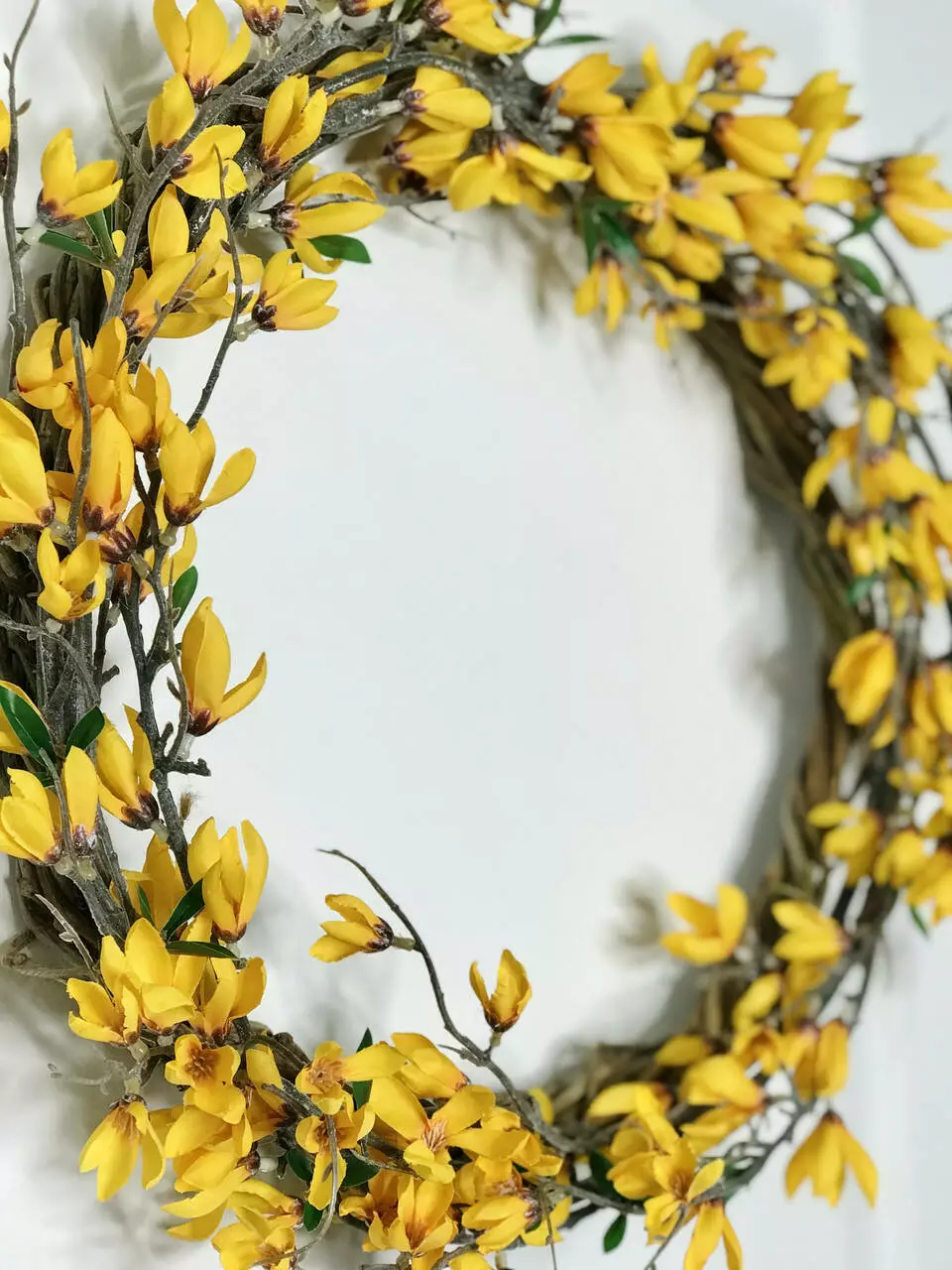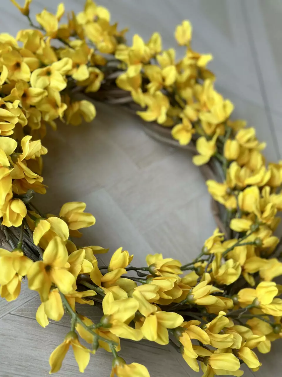 Весняний декоративний віночок із форзиції - це творіння сповнене яскравості та радісної енергії весняного дня. Витончені гілочки форзиції вкриті яскраво-жовтими квіточками, надають віночку виразний та енергетичний характер і дарують вашому простору частинку сонця та тепла.