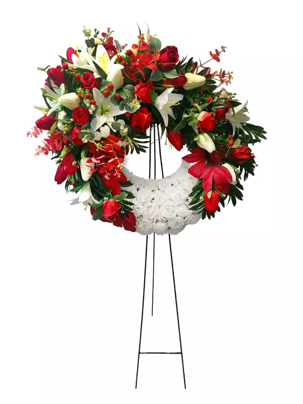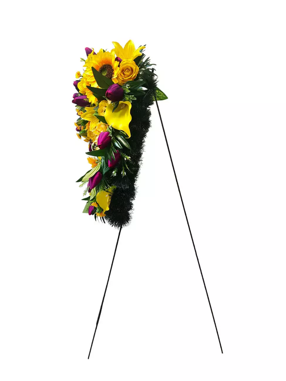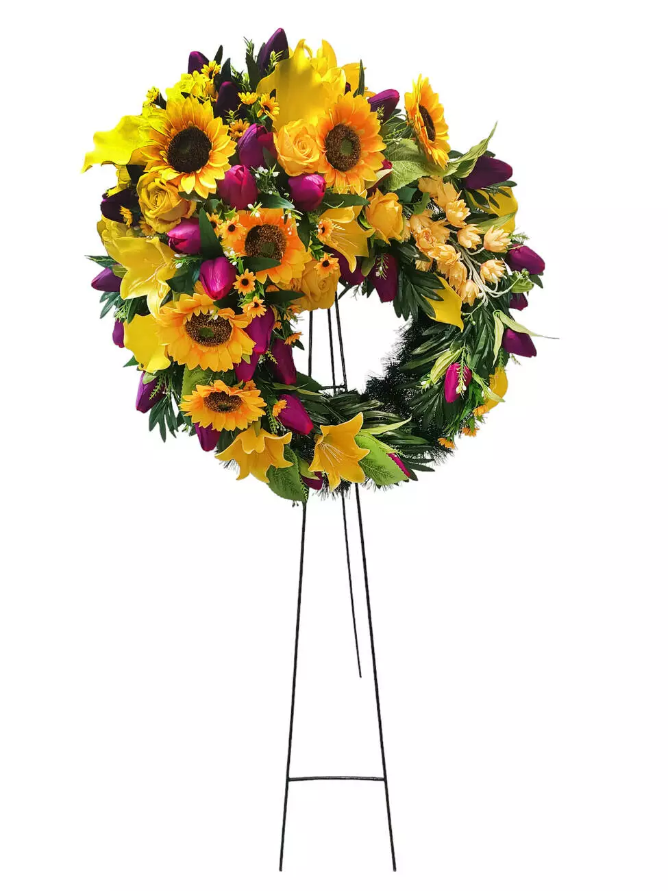 Вінок зі штучної хвої на підставці, прикрашений головами тюльпана,