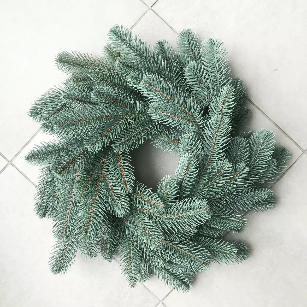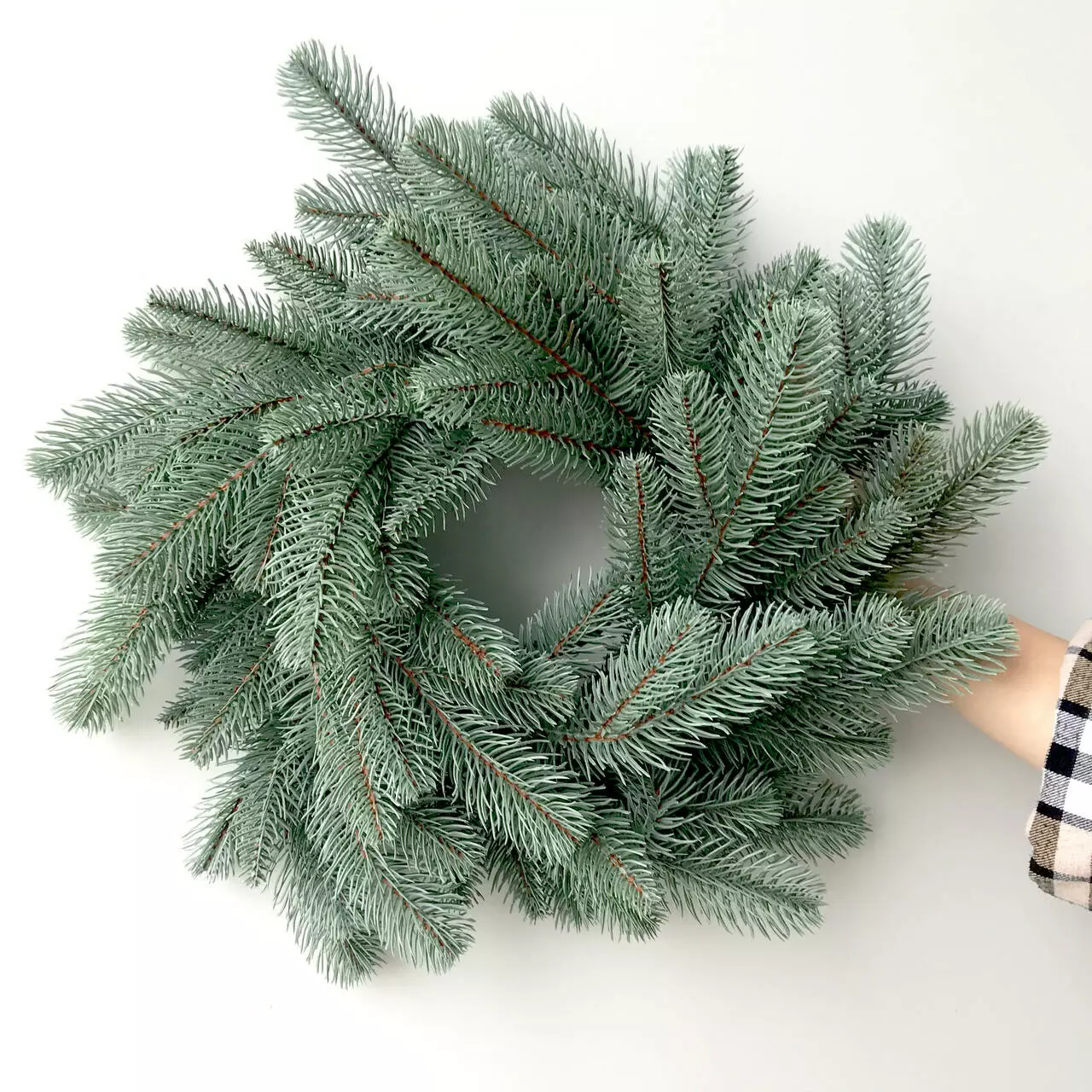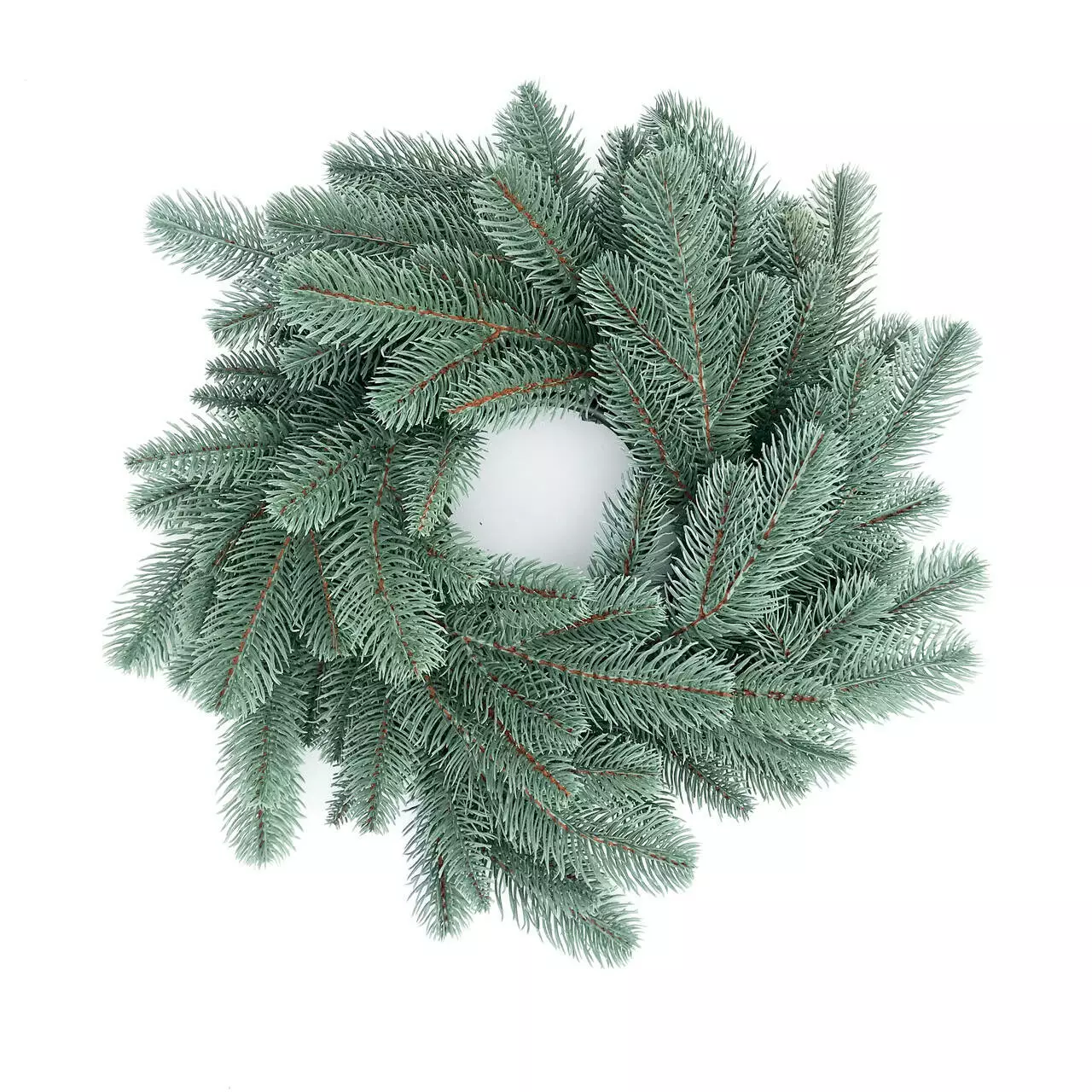 Новорічний декоративний вінок діаметром 40 см являє собою переплетені гілки штучної ялинки. Виготовлений з 100% литої хвої. Голочки як у живої ялинки, але м'які і не колючі. Без декора.