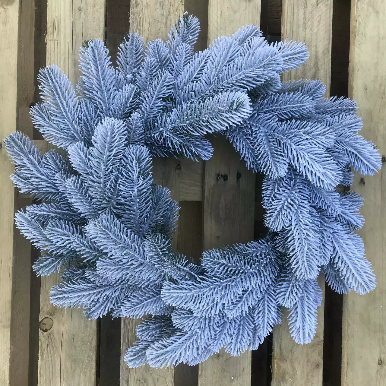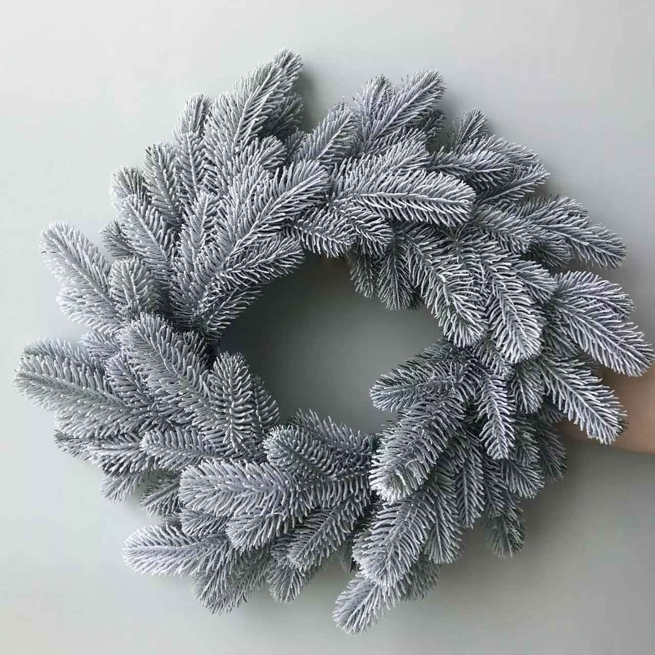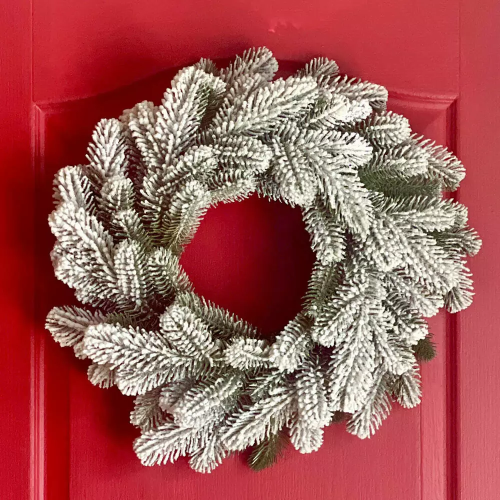 Декоративний різдвяний вінок виготовлений з переплетених гілок штучної ялинки. Він виготовлений з 100% литої хвої, а його голочки нагадують живу ялинку, але вони більш м'які та не колючі. Об'ємне густе напилення на вінку, реалістично імітує сніг, який тільки що впав на гілки пухнастими пластівцями. Матеріалом розпилення є натуральна бавовна, він екологічний і не має запаху, безпечний для дітей і дорослих.