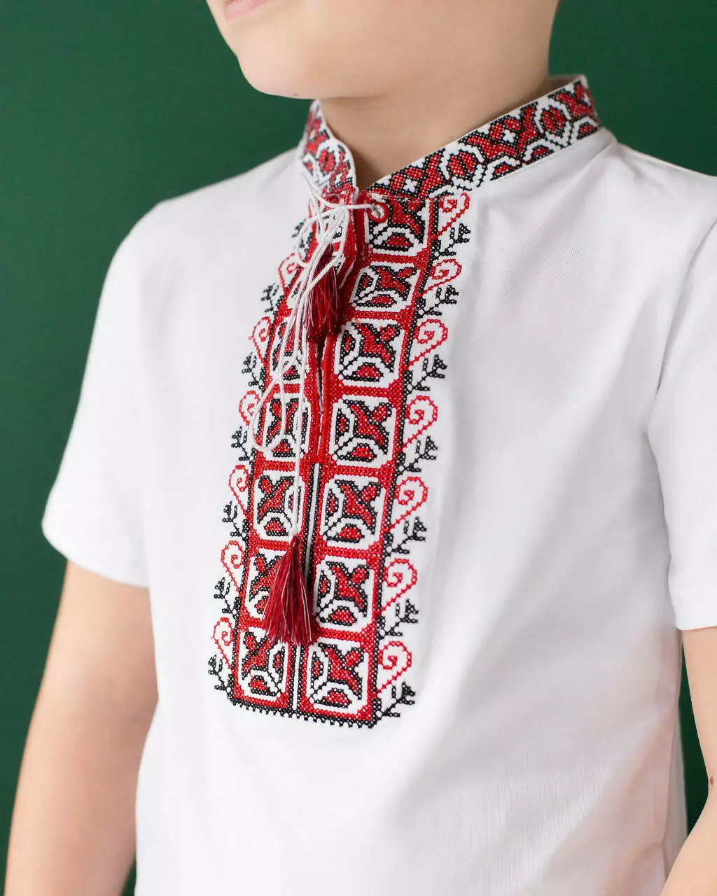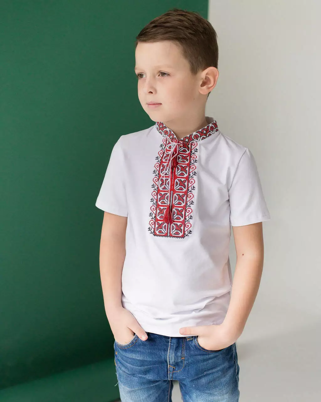 Стильна вишита футболка для маленьких парубків. Дивовижна вишиванка з коротким рукавом декорована вишуканим орнаментом в патріотичному стилі. Важливу роль у вишитій футболці відіграє колір орнаменту. Червона вишивка є символом вогню, світла, любові. Модель доповнена яскравими кутасиками і коміром-стійкою. Виконана із натурального матеріалу, така вишиванка практична - не деформується і не линяє після прання, а також приємно сідає по тілу Вашого малюка. Не пропустіть можливість придбати чудову вишиванку для улюбленої дитини в інтернет-магазині ”Меланіка”!