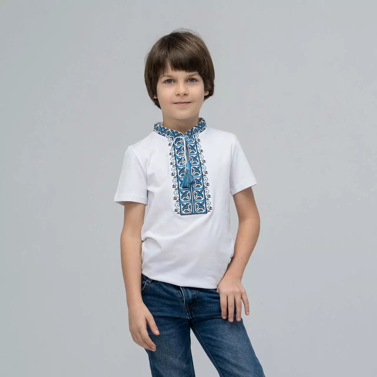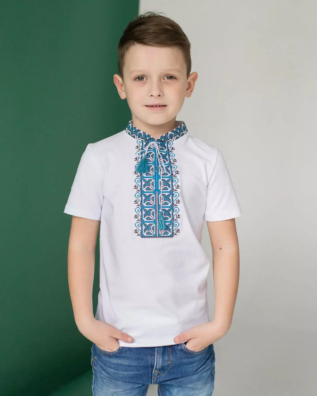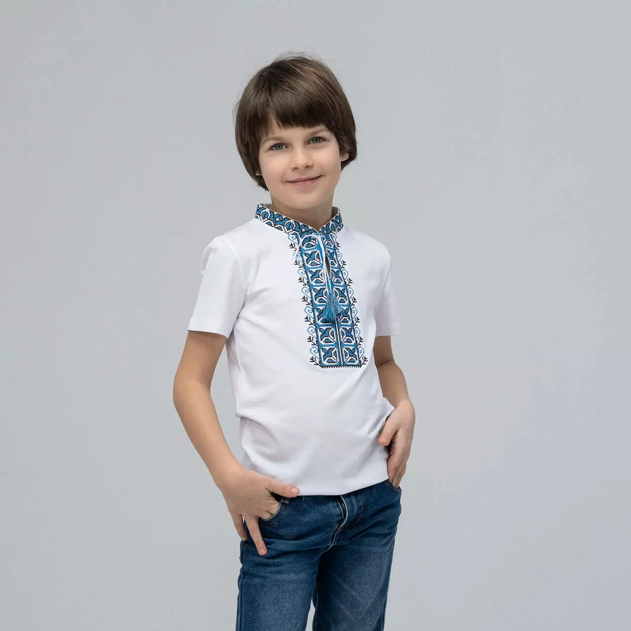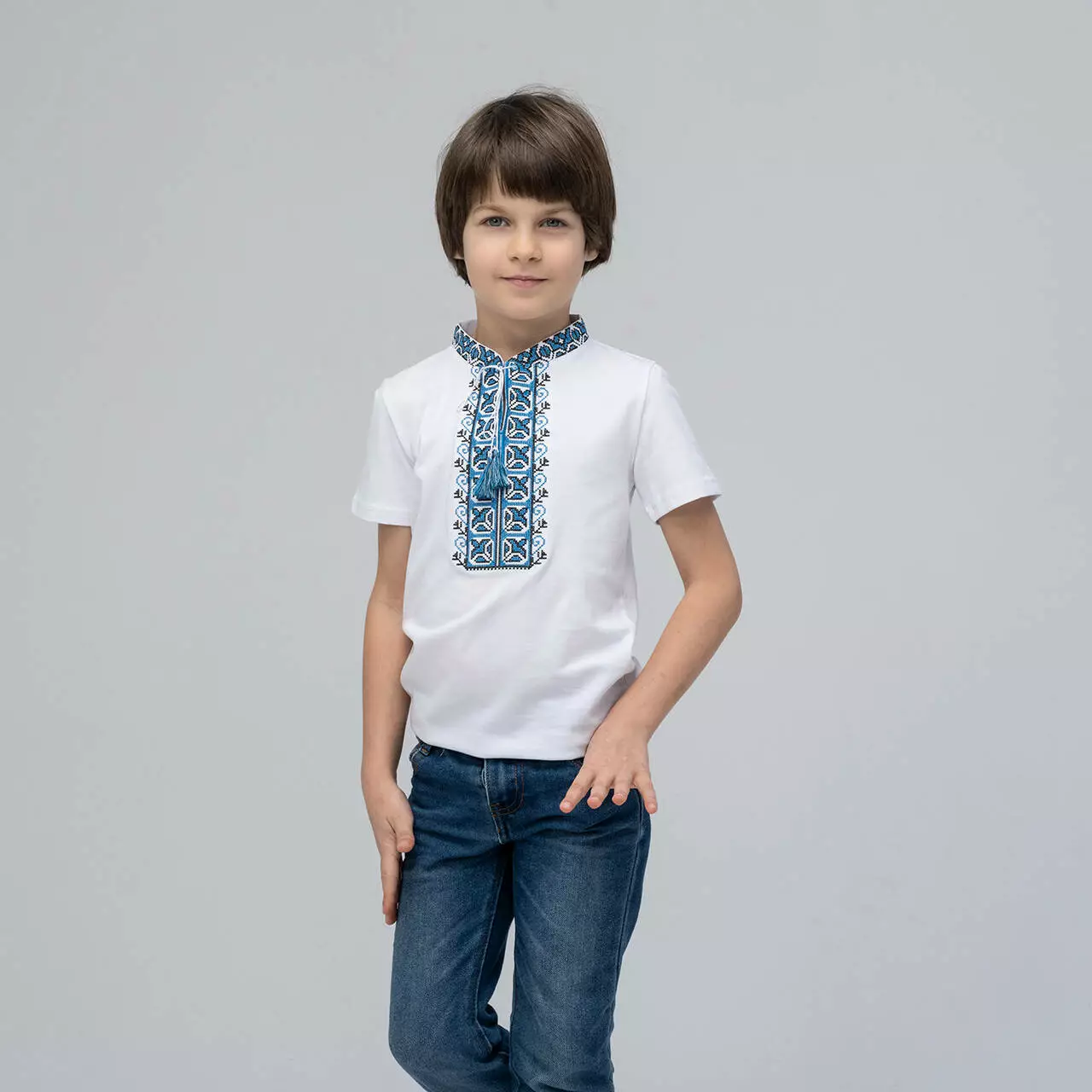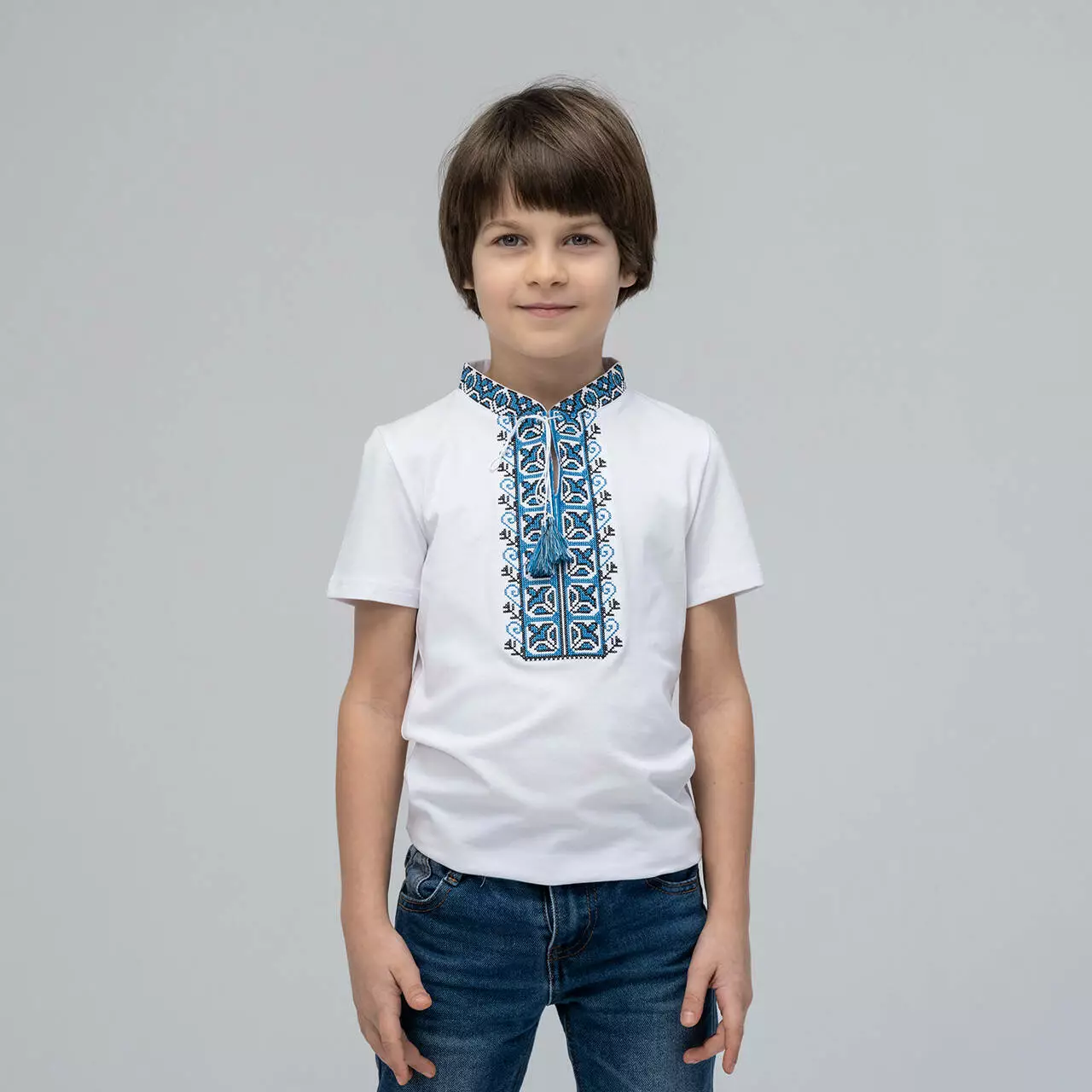 Вишиванка для хлопчика Дем'янчик з синім орнаментом стане прекрасним доповненням до дитячого гардеробу в цьому сезонні. Така вишиванка або вишита футболка для хлопчика стане незамінним атрибутом для свята у школі або повсякденного носіння в теплу погоду. Дана модель виглядає модно, стильно та патріотично. Ваш хлопчик з радістю буде носити таку футболку з яскравою вишивкою, а дівчатка та однолітки будуть заздрісно поглядати. При створенні даної моделі ми намагалися поєднати багаторічні традиції та сучасний стиль. Власне тому і розібрали синій орнамент, адже цей колір сімволізує: воду, небо, чистоту думок та помислів. Універсальність моделі дозволяє поєднувати модель з брюками або джинсами. Фасон дитячої вишиванки в традиційному українському народному стилі, розрізами, комірцем-стійкою,коротким рукавом та традиційним геометричним орнаментом.