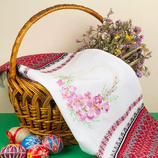 Запашні перші квіти та ніжні вербові «котики» - тендітні провісники весни й пробудження. Якісна вишивка блискучими нитками на тлі білосніжного полотна тканого (не фарбованого) рушника дарує радість оновлення та бадьорість. Таким рушничком зручно накрити великодній кошик або прикрасити кімнату на Пасху. Святкуйте з вірою та вдячністю!