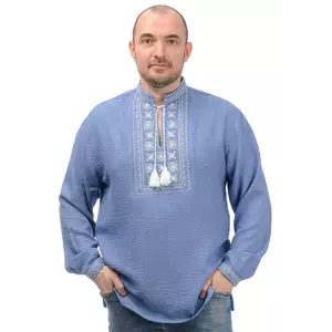 Головною окрасою й одночасно чарівною відмінністю сорочки є вишиті геометричні орнаменти. Білий візерунок довершує елегантний образ і робить виріб ще більш оригінальним. Крій сорочки вільний, рукава на манжетах і застібаються на ґудзик.