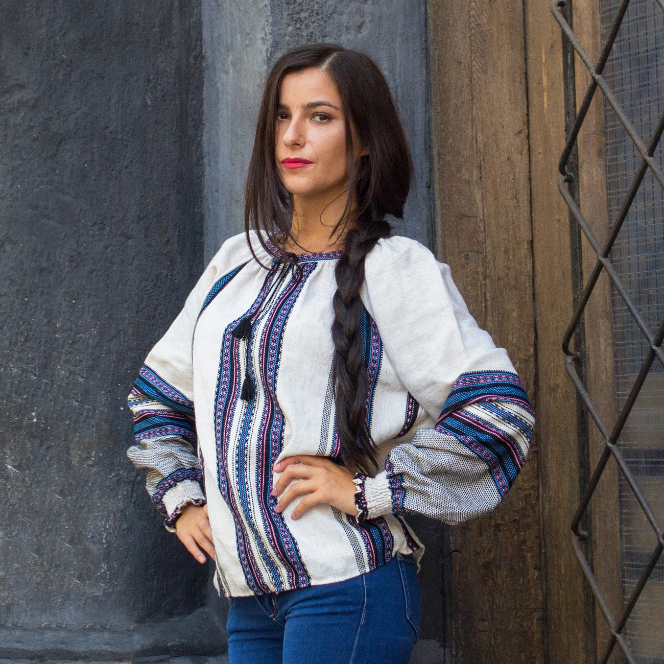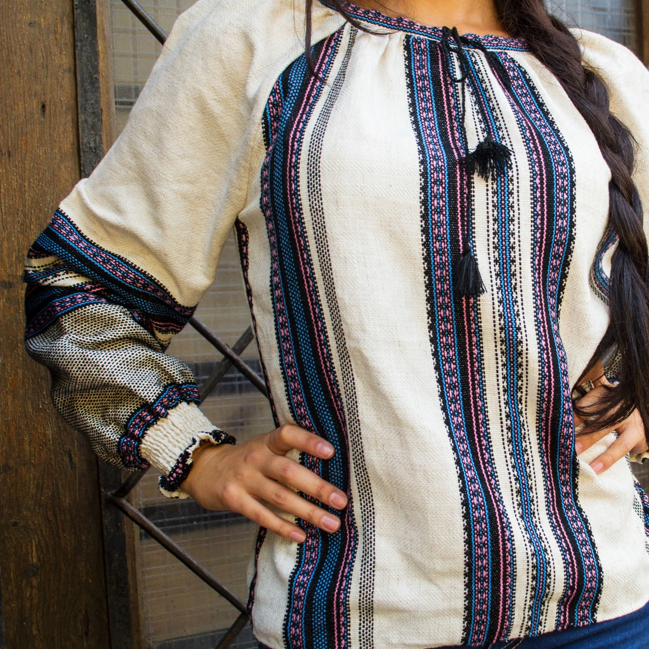 Жіноча вишита сорочка, виконана на сірому тканому полотні