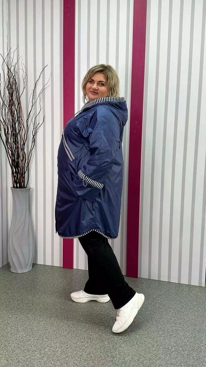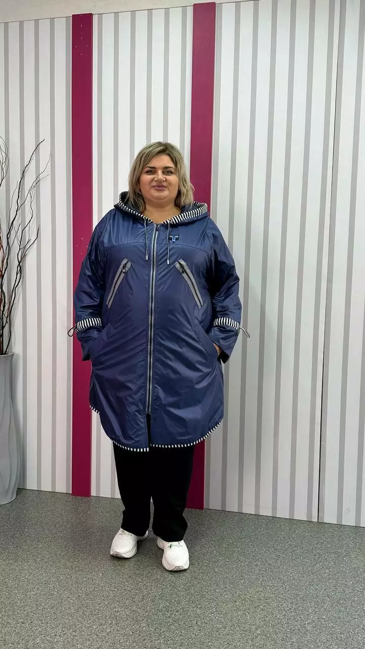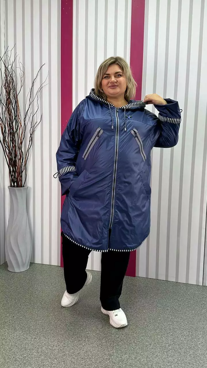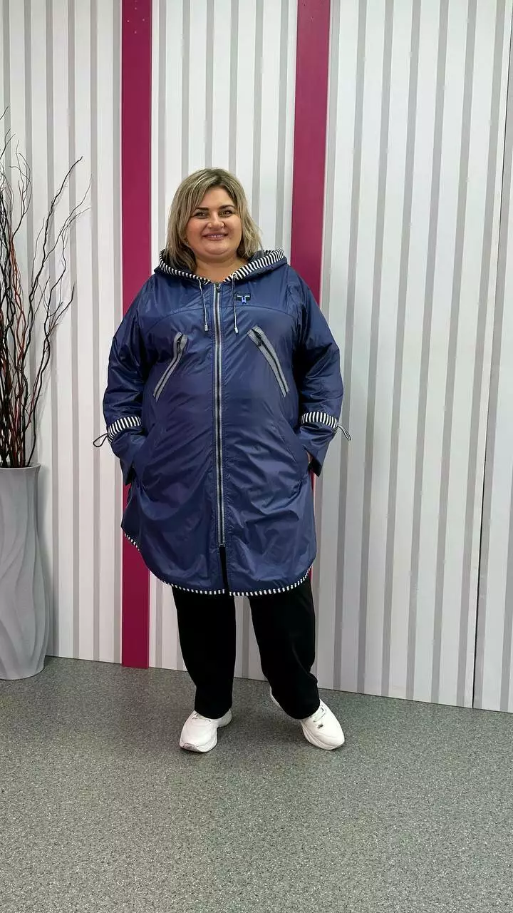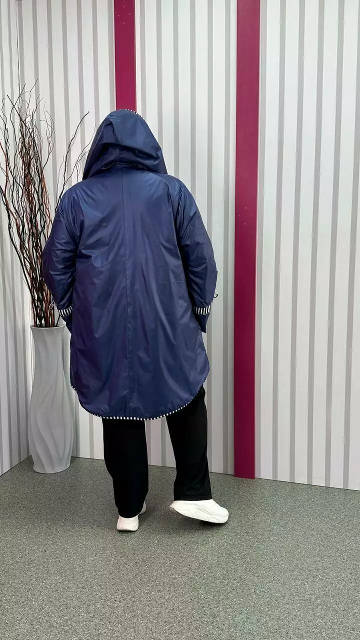 Вітровка на флісі з турецької плащової тканини "лаку" - не промокає, не продувається, м'яка, дуже комфортна. Підкладка-якісний фліс, рукав вшитий окремо, тому підкладка не тягне за одягом, дуже комфортна в носінні. Фасон вільний, по грудях оверсайз, рукав зі спущеною проймою до талії, широкий, в районі пензля ширина регулюється шнурком. З об'ємним капюшоном, кишеня листочка. Якісна турецька змійка в смужку та оздоблення в смужку надають виробу шикарного вигляду.