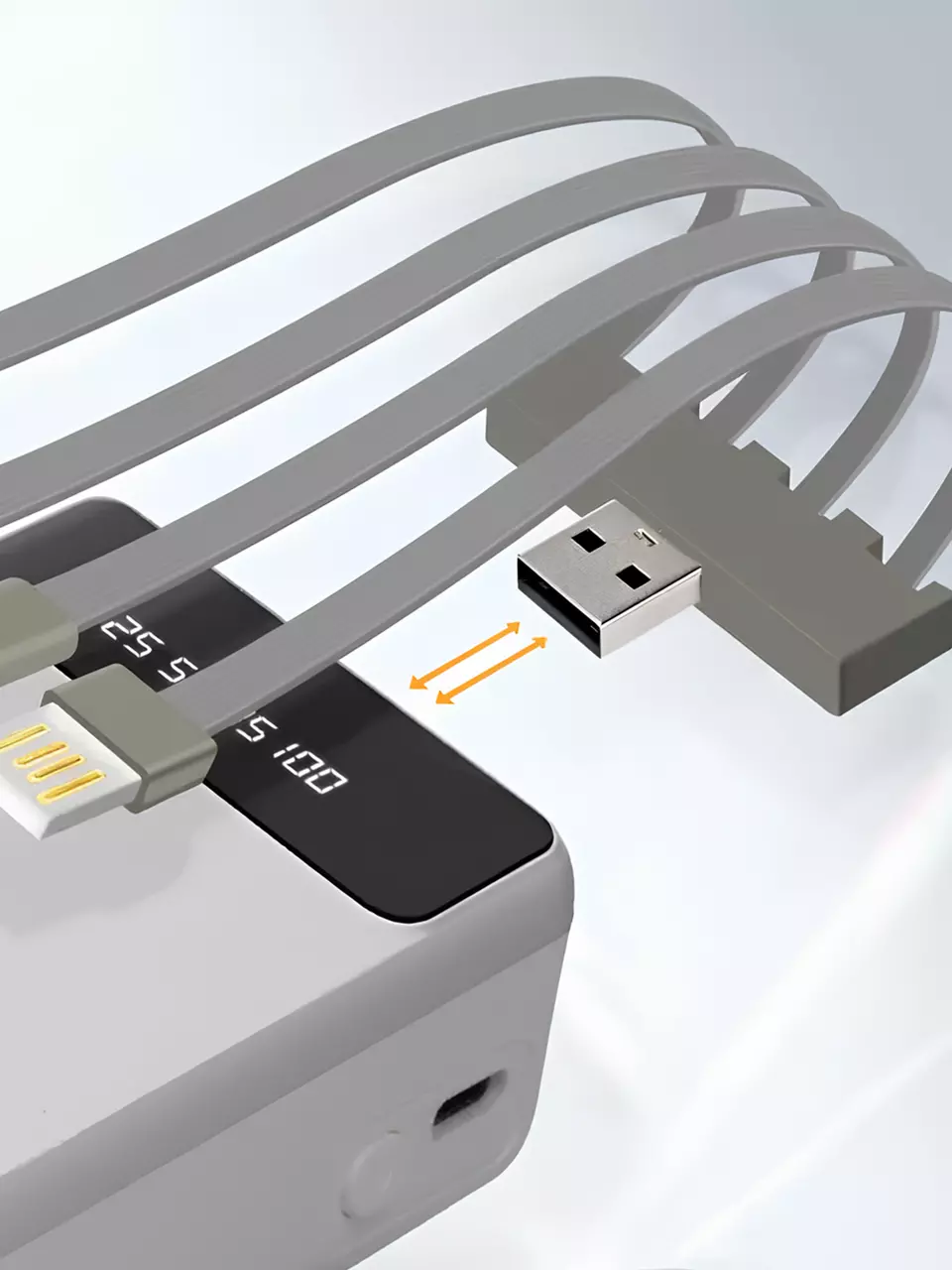3. Встроенные кабели и универсальность: Встроенные кабели Micro-USB, Lightning и USB-C делают этот повербанк совместимым с большинством современных устройств. В комплект также входит USB-кабель для зарядки самого павербанка, что добавляет удобства и универсальности.