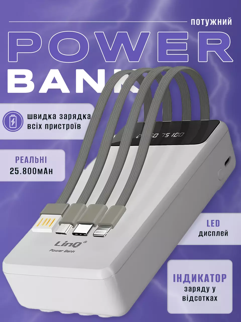 Внешний аккумулятор Powerbank Linq TT26000 25800 мАч 22,5 Вт зарядное устройство встроенный кабель usb 4 в 1