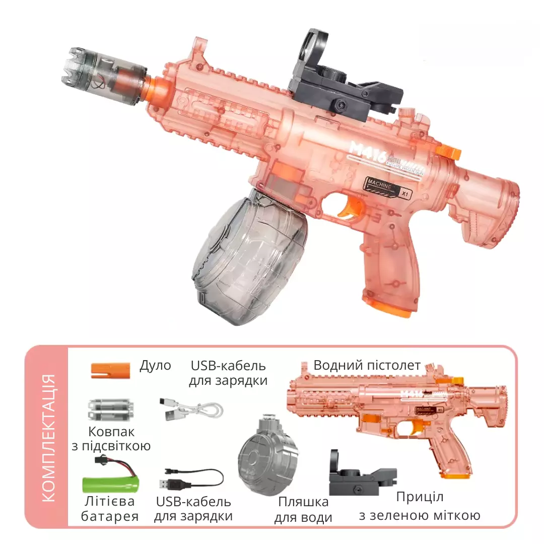 Комплектация: водяной пистолет М416, дуло, глушитель со световыми