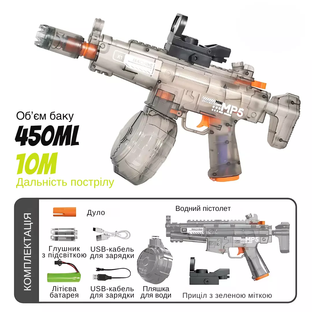 Комплектация: водяной автомат МР5, дуло, глушитель со световыми
