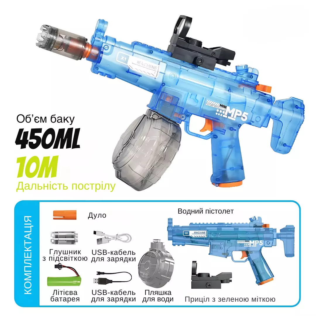 Комплектация: водяной автомат МР5, дуло, глушитель со световыми