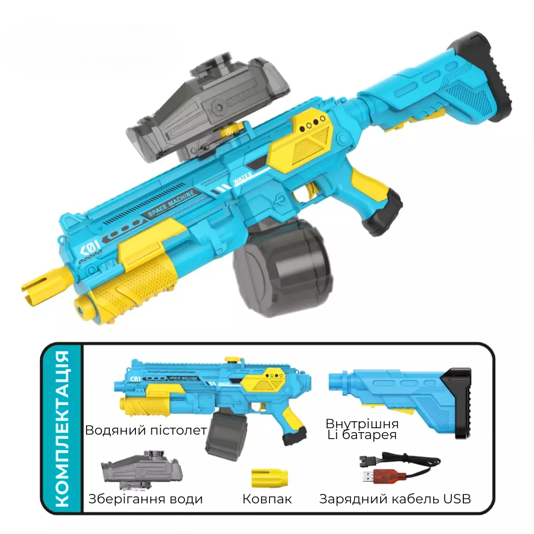 Комплектация: электрический водяной пистолет, аккумулятор, кабель