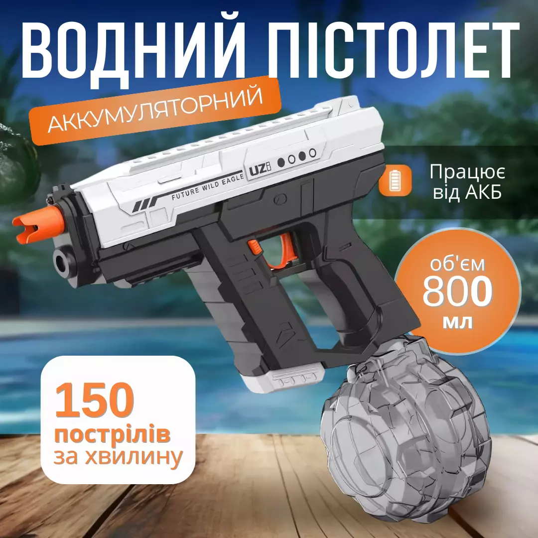Комплектация: водяной пистолет, обойма 800мл, аккумулятор,