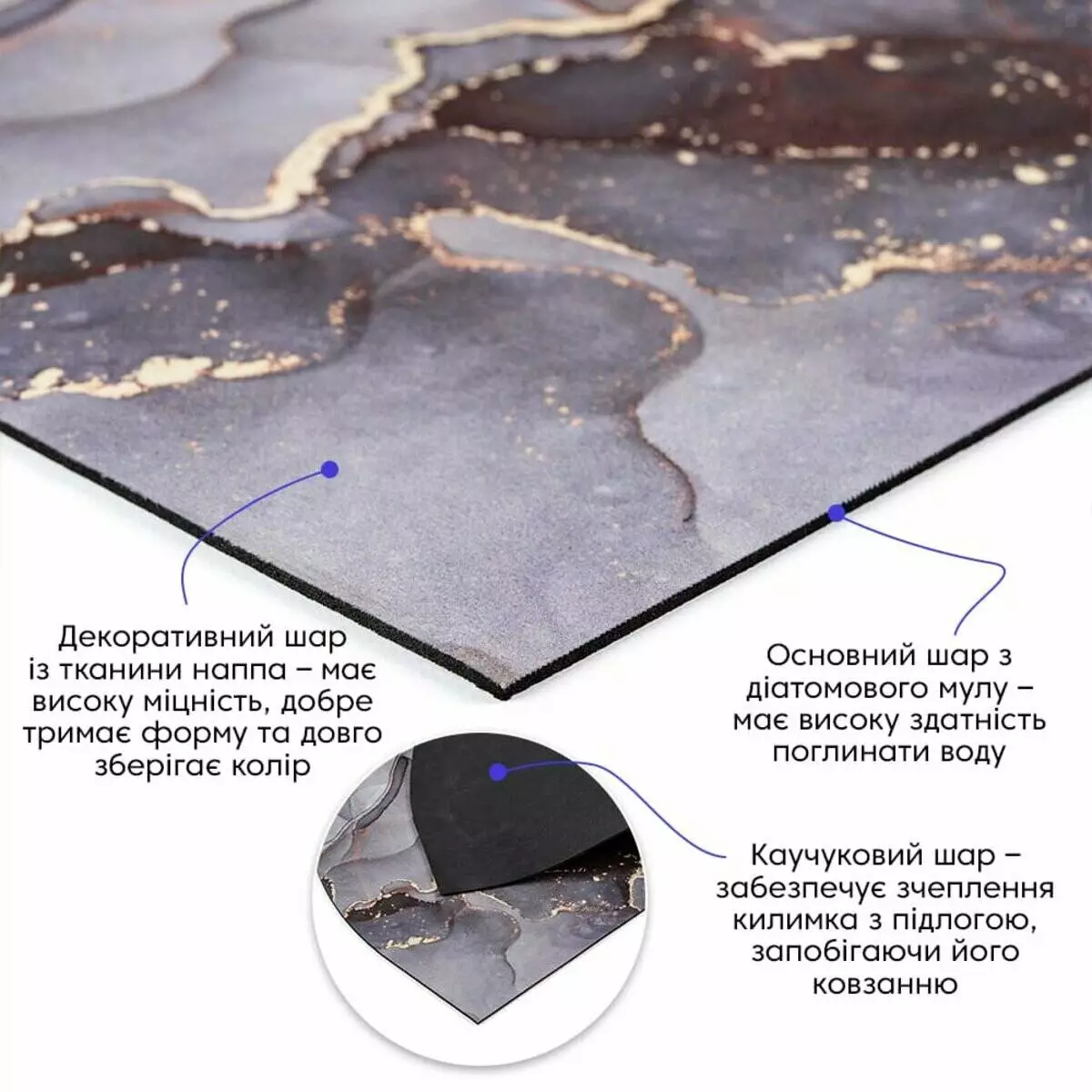 • Каучуковий шар – забезпечує зчеплення килимка із підлогою, запобігаючи його ковзанню на гладких або слизьких поверхнях.
