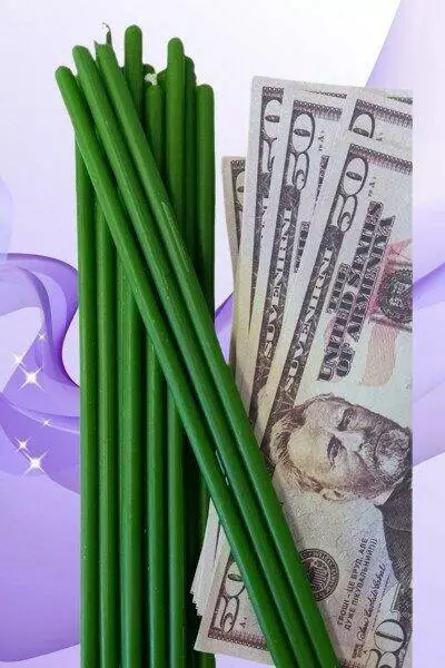 Зелена свічка несе в собі енергію багатства, достатку та любові, фінансового добробуту, багато здоров'я. Зелена воскова свічка використовується для приваблення грошей, добробуту, успіху в кар'єрі та власному бізнесі. Крім багатих, зелений колір безпосередньо пов'язаний з усіма начинками.
