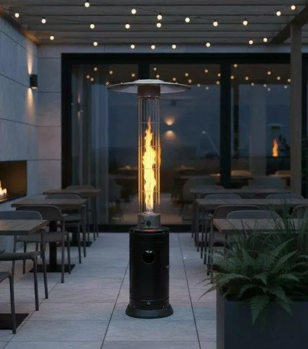 навіть у прохолодні вечори. Прозора скляна труба підкреслює природний вогонь,