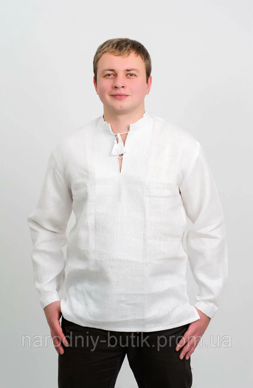 Льняная мужская вышиванка "белая по белому" с длинным рукавом